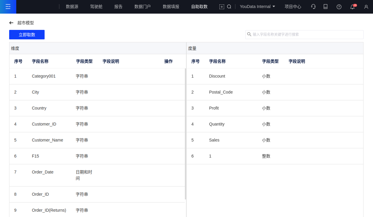 (2)在模型详情页界面,会展示该模型的所有维度、度量字段,包括字段名称、字段类型和字段说明;且维度字段可查看数据字典;