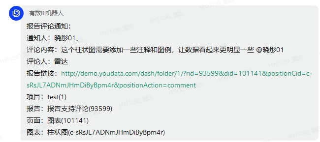 在用户创建的报告被评论、发表的评论被回复、他人回复时被@的场景下会收到Webhook的对应消息通知,包含评论内容、评论人、报告链接、评论图表所属信息等;通过通知中链接可以直接进入对应报告查看相关评论内容。