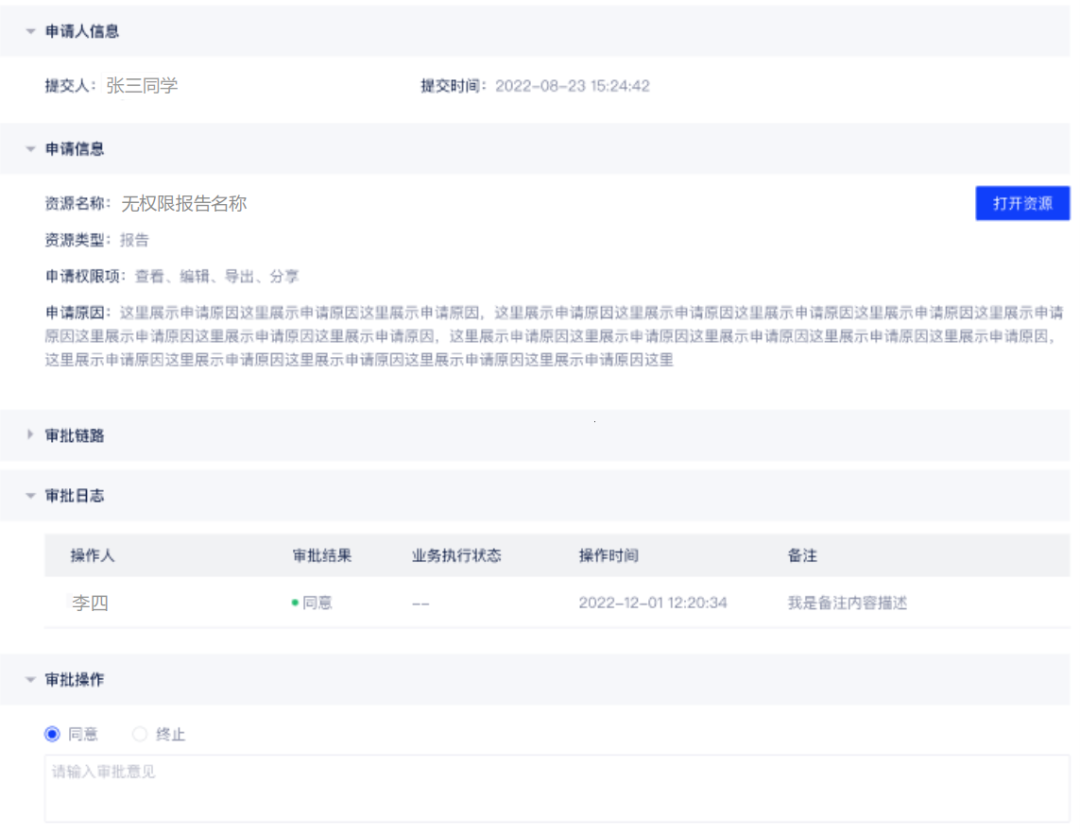 申请人发起资源权限申请后,审批任务流中匹配到的用户就会收到审批消息提醒(系统消息、邮件、短信、钉钉),用户通过消息进入审批界面,查看申请信息后执行审批。下图为审批示意: