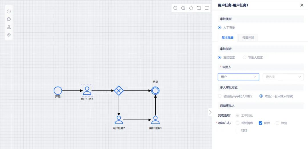 - 用户任务:需要用户完成操作的节点,如审批、编辑;可添加多个,节点间通过线路