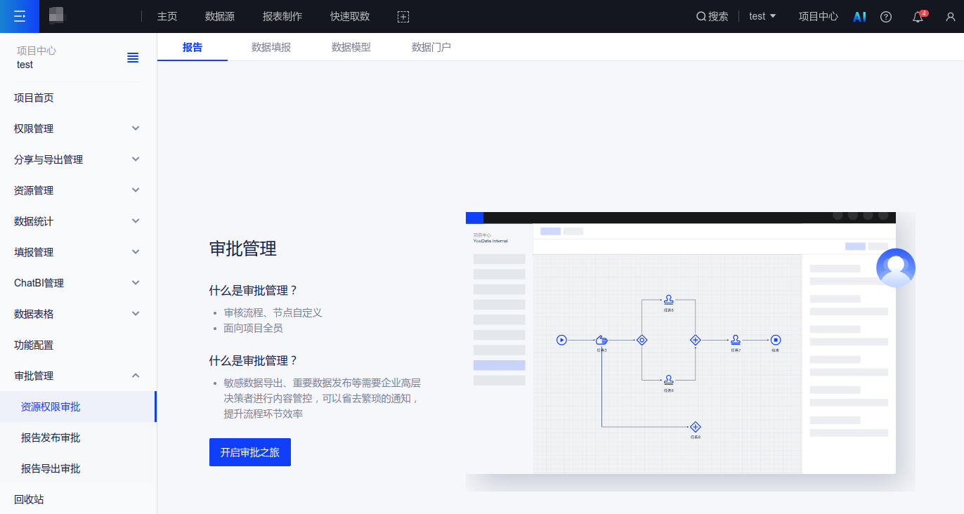 依次点击项目中心-审批管理-资源权限审批,选择需要设置审批流的对象(已支持报告、数据填报、数据模型和数据门户,后续将支持其他类型资源),然后“开启审批之旅”或配置审批流程: