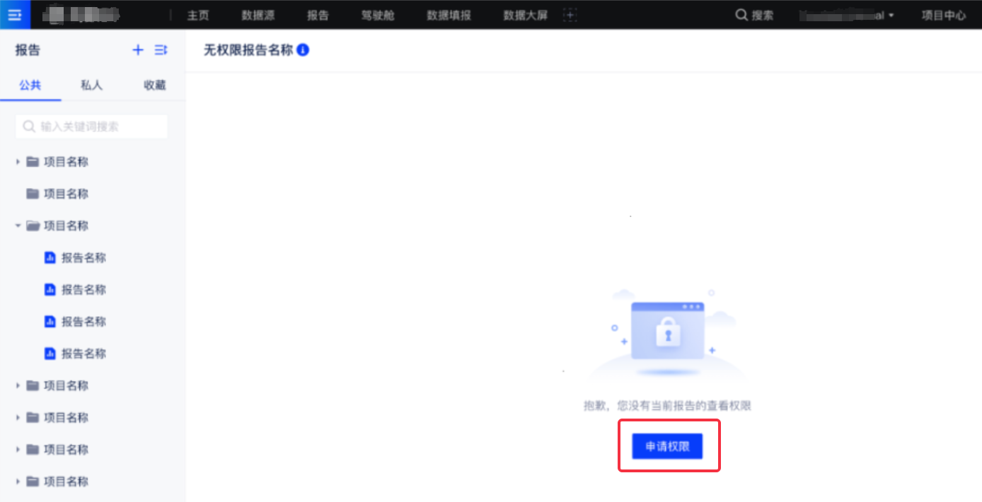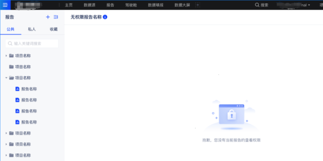 依次点击项目中心-权限管理-角色管理,在角色编辑界面勾选“无权仍可见”选项后保存(已支持报告和数据填报,后续将支持其他类型资源),之后拥有该角色的用户就可以通过资源列表或者链接看到没有查看权限的资源,但只能看到标题。