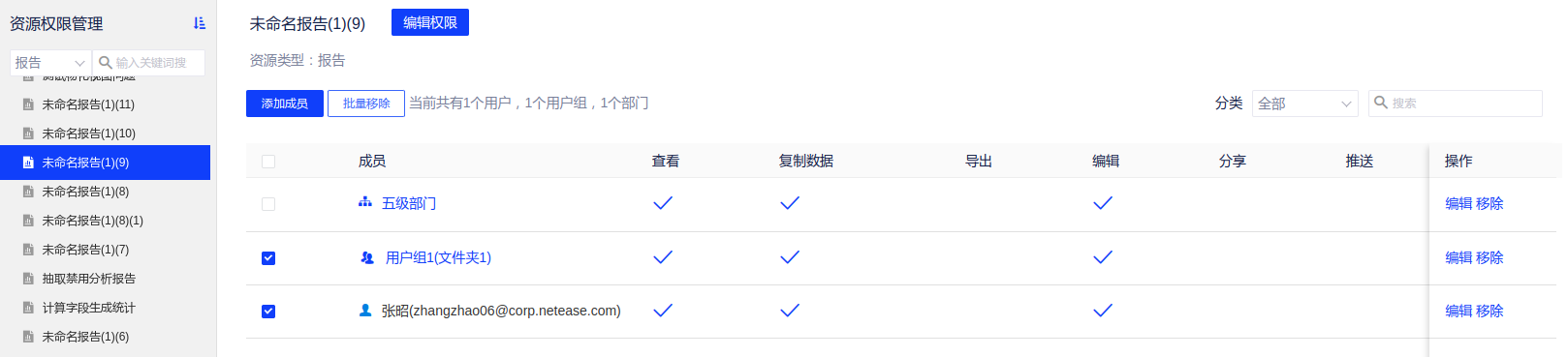 (3)点击确定后,即完成资源授权,上图中被添加的用户/用户组/部门即获得该报告的查看、复制数据和编辑权限;
