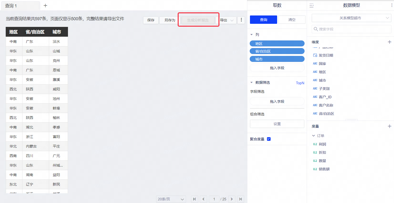(3)选择开启关系的模型进行取数,不支持生成分析报告;