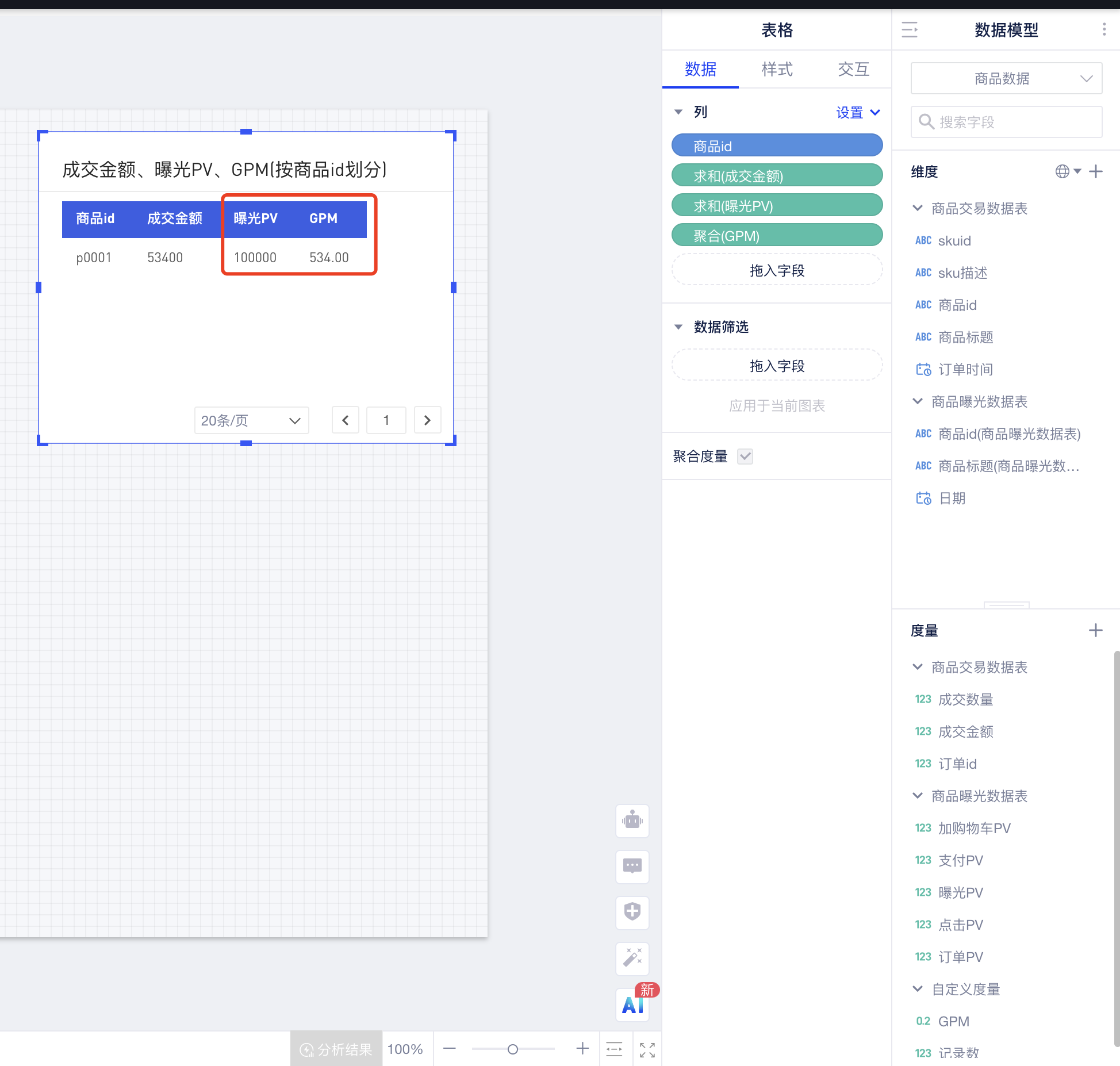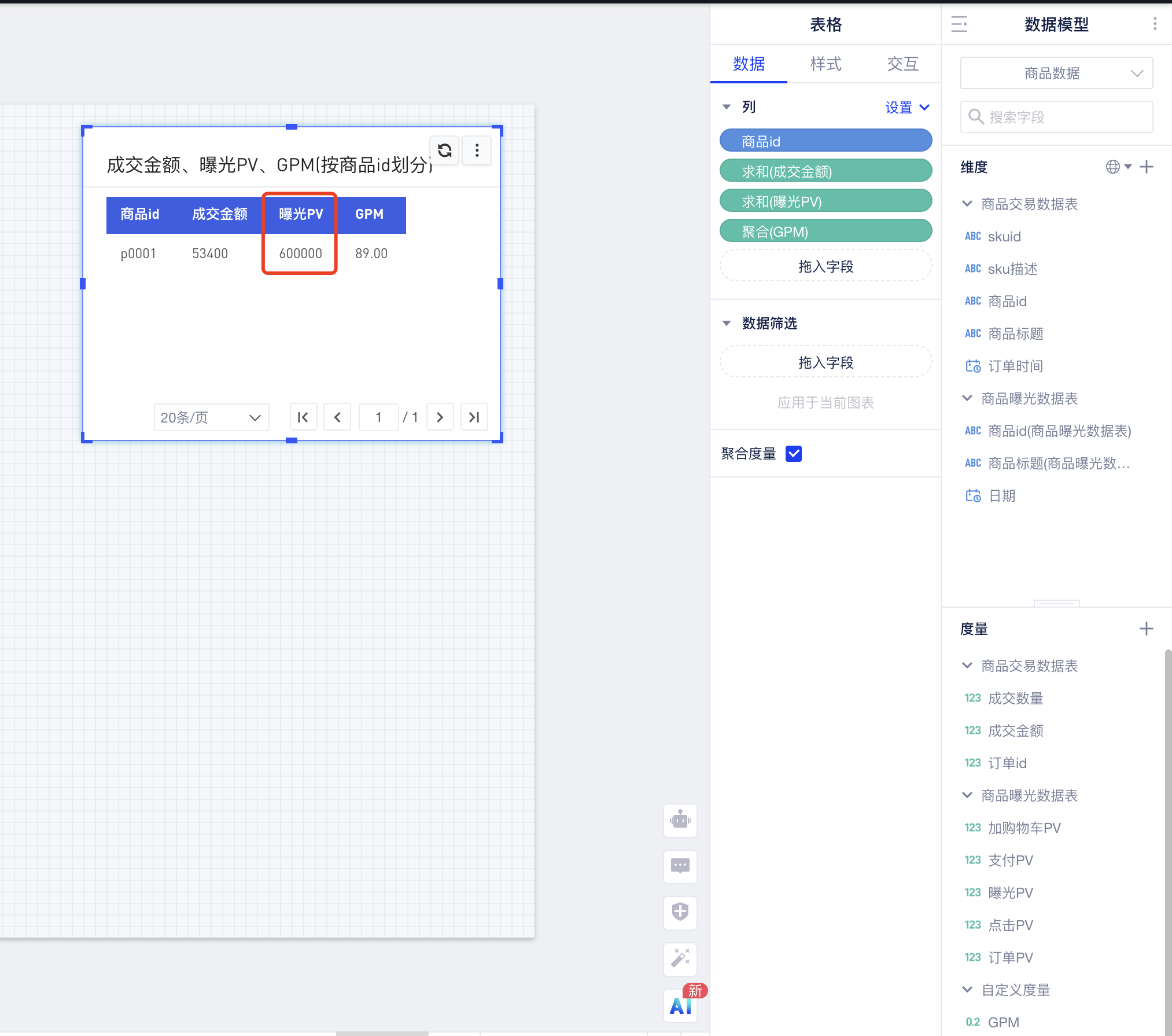 拖入商品id、成交金额、曝光PV几GPM,可以发现曝光PV指标展示的值是正确的,未发生数据膨胀,由此得到了正确的GPM: