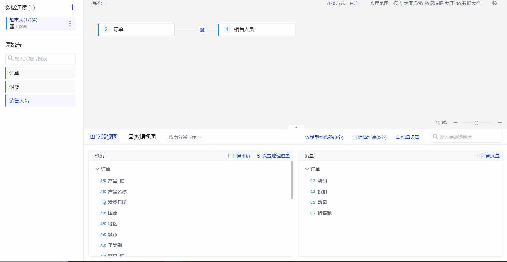 您可以在普通数据模型的基础上开启关系,即增加一个关系层,也可以直接在原始的物理表上进行关系模型的创建。