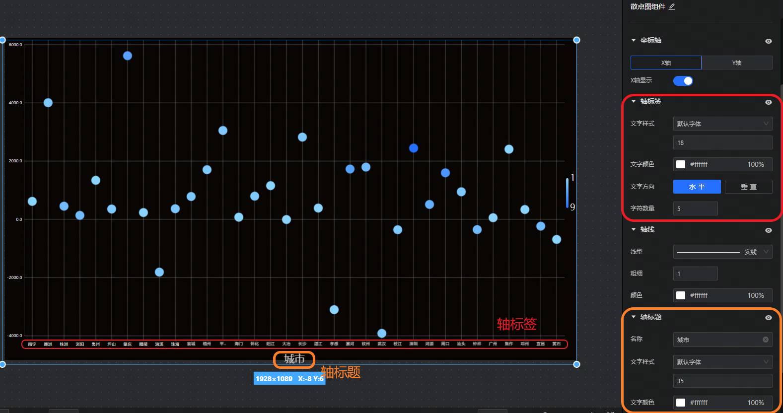 - 坐标轴:设置散点图x轴、y轴的轴标签、轴线、轴标题等信息。