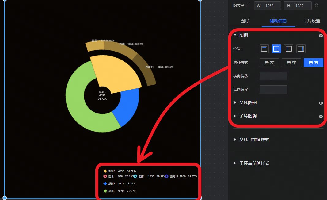 - 图例:设置双层轮播饼图是否要展示图例,以及图例的展示位置、文字样式。