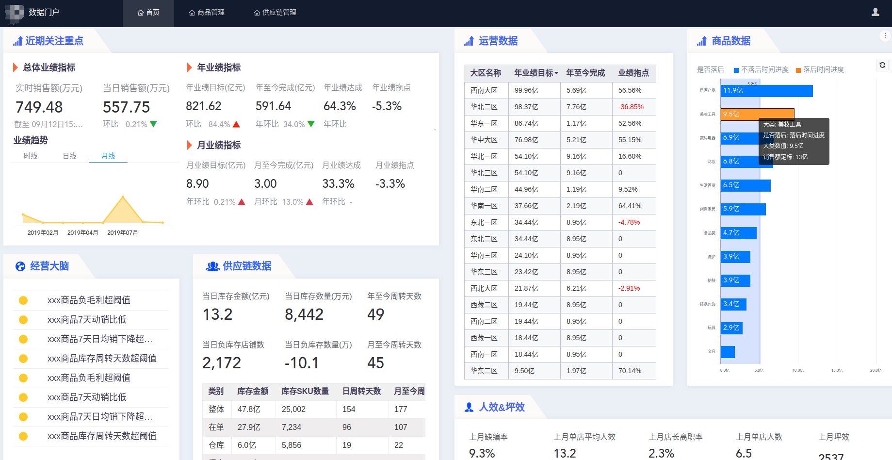 公司内部的统一数据平台,典型如“xx公司数据门户”,“xx公司大盘”等内部数据平台,这些产品针对公司的运营情况提供统揽性数据分析,管理层可在门户上集中看到销售、市场、运营、财务、售后、人力资源等各方面的数据;