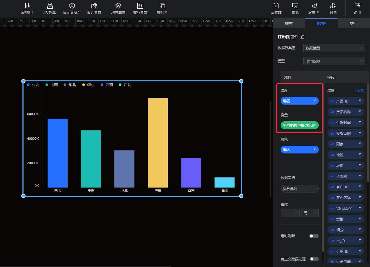 将字段“地区”和“平均销售单价”分别拖入图表,即可查看到各地区的平均销售单价情况。