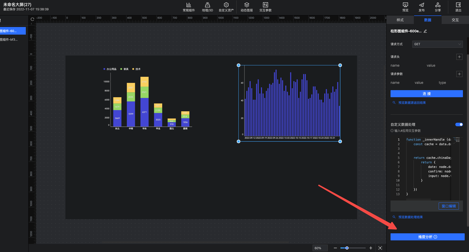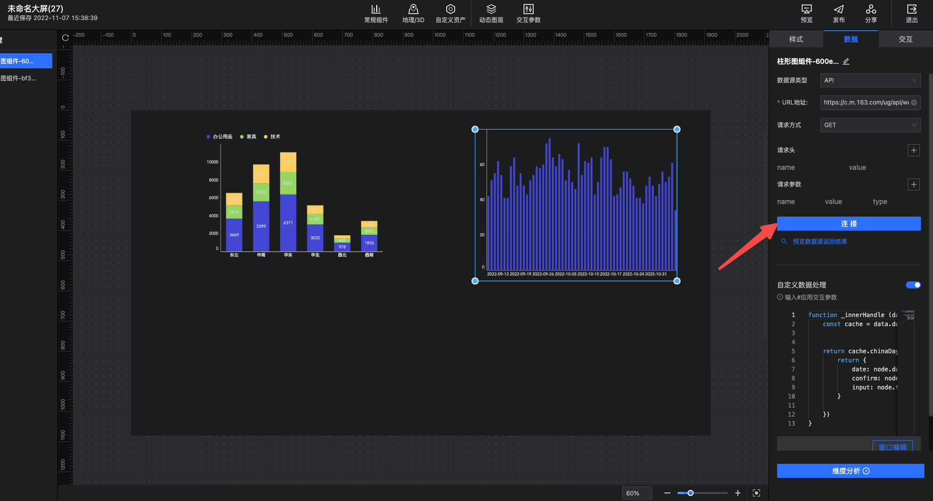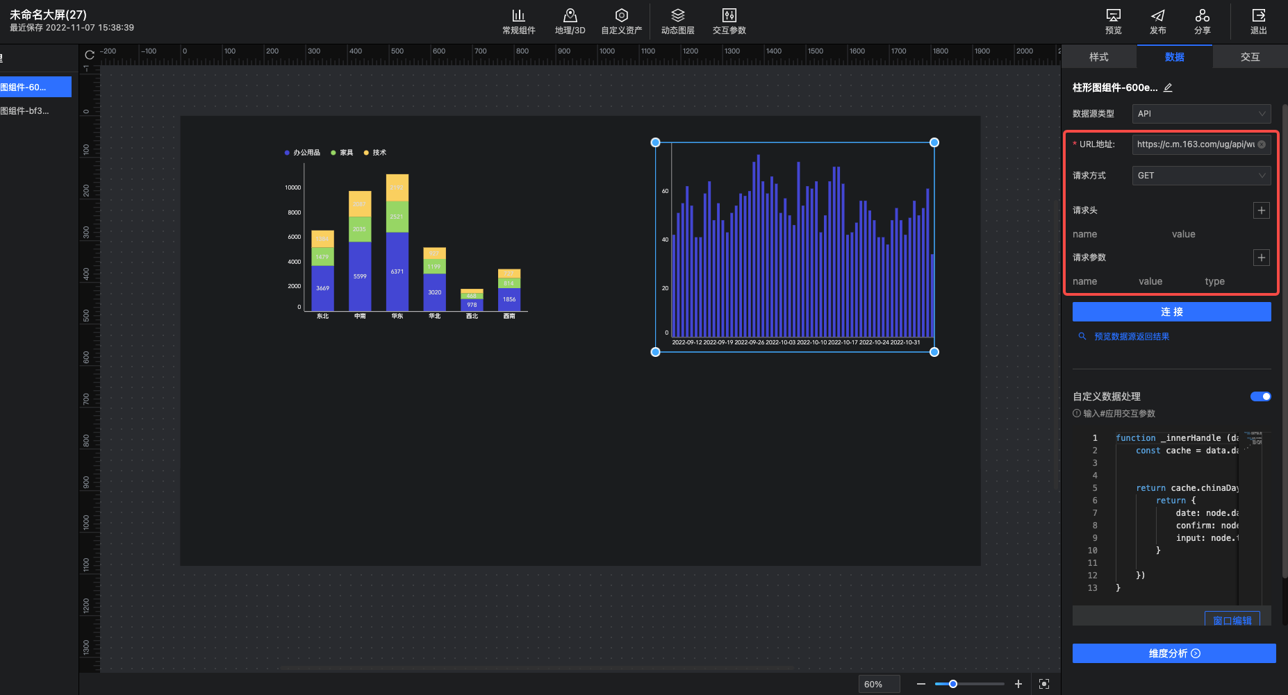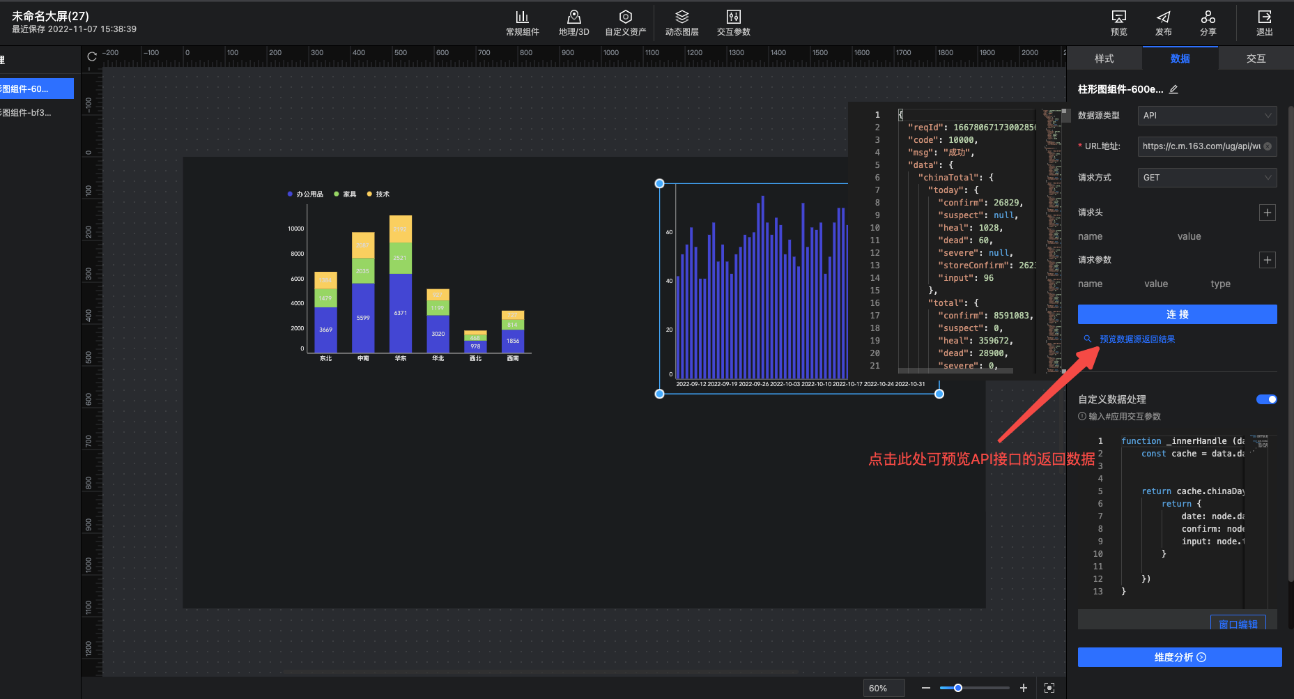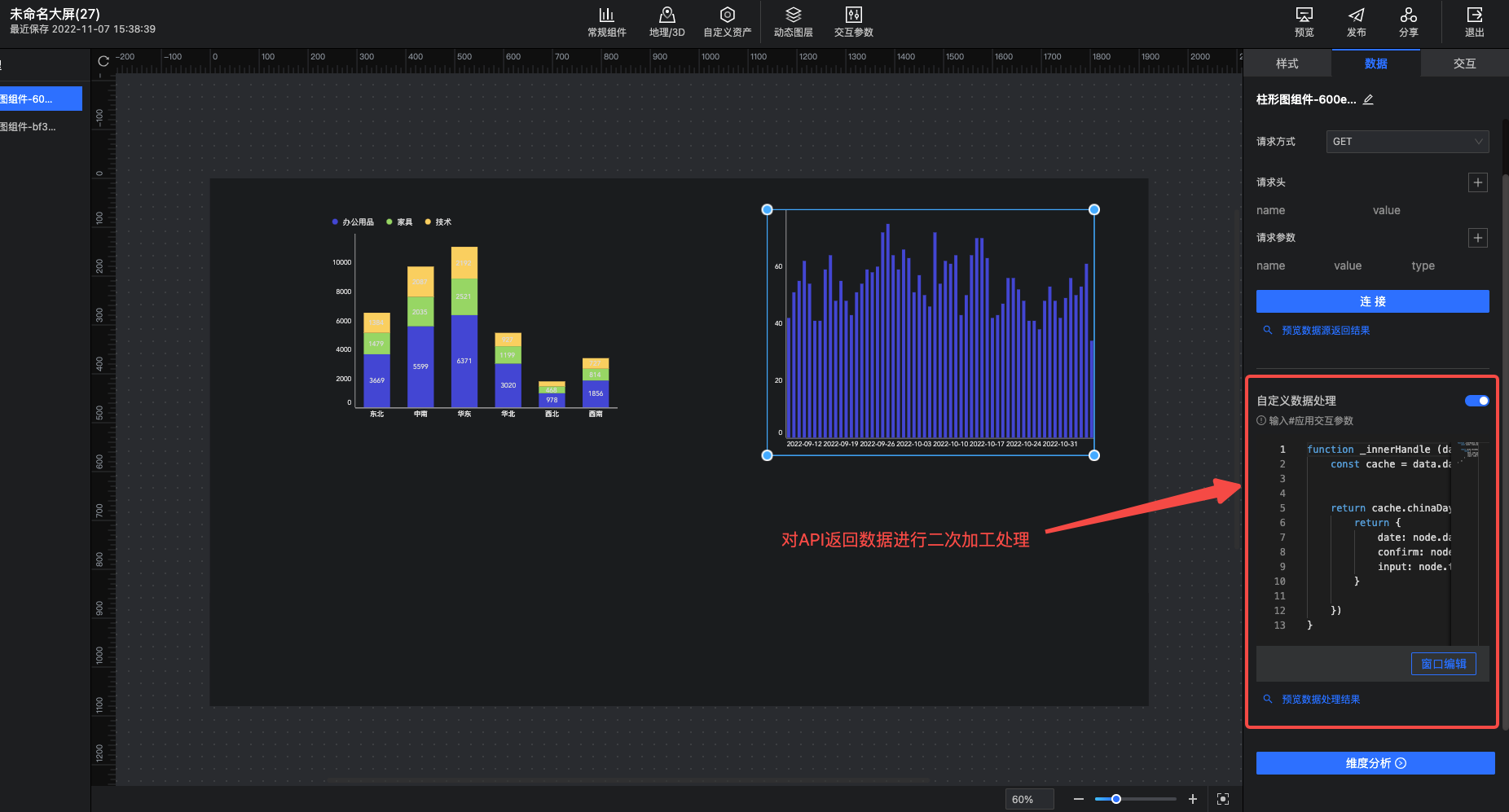 如果API返回的数据不符合系统要求的格式(API接口需返回跟上方“静态数据”章节格式要求一致的JSON数据),你还可以使用“自定义数据处理”功能对API接口的返回数据进行二次加工数据。