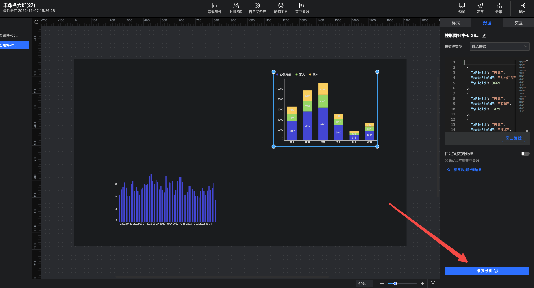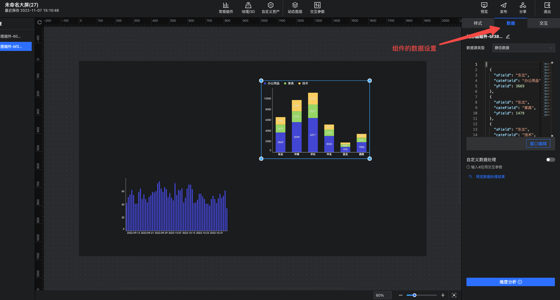 - 静态数据:添加组件后,系统会自动为组件设置一段静态的JSON数据,用户可修改JSON数据,直观看到组件的变化。适用于大屏搭建阶段。可以敏捷地使用假数据调试,更快地看到大屏效果。同时避免搭建阶段就产生大量数据请求,减少搭建阶段的编辑器性能消耗。