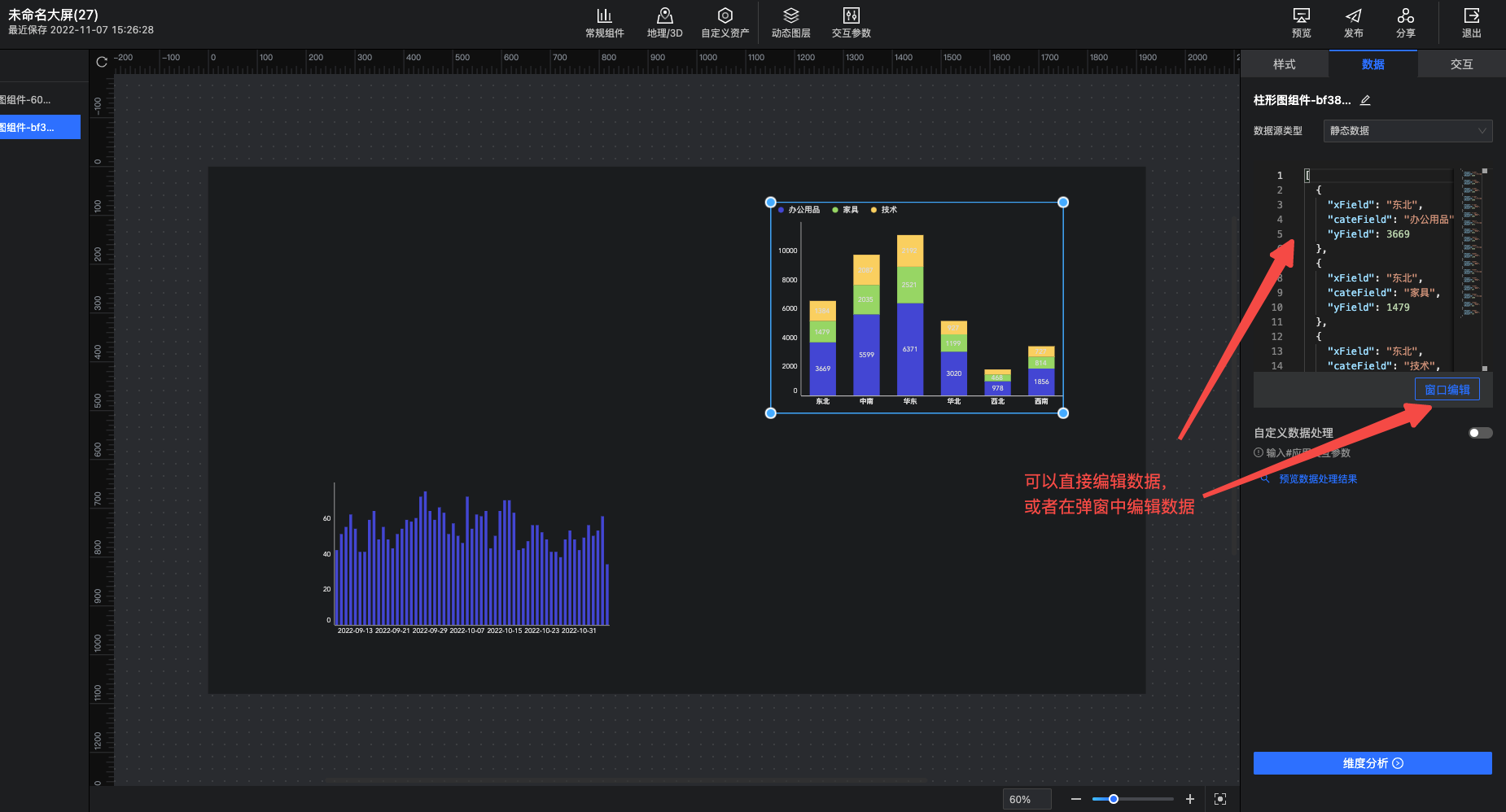 选中组件后,在组件的“数据”面板,将数据源类型切换为“静态数据”后,可以直接编辑JSON数据。也可以在弹窗中更方便地修改。修改后将实时对组件生效。