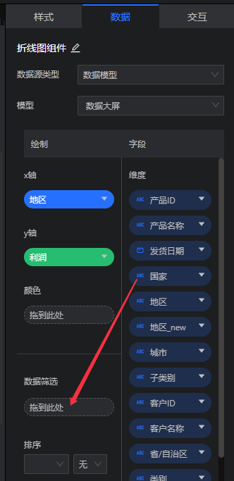 当组件的数据源为“数据模型”时,则可对数据进行筛选操作。支持拖入字段配置数据筛选条件,可拖入多个字段。