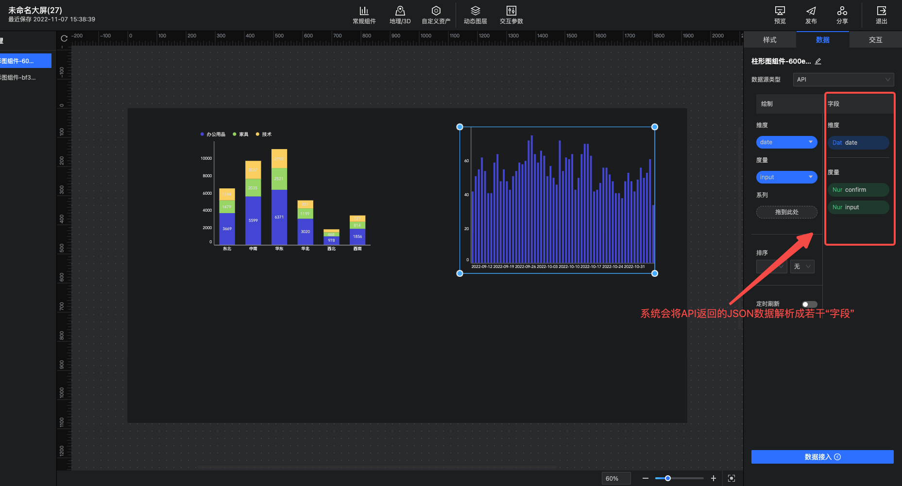系统会将API接口返回的JSON数据解析成若干“字段”。