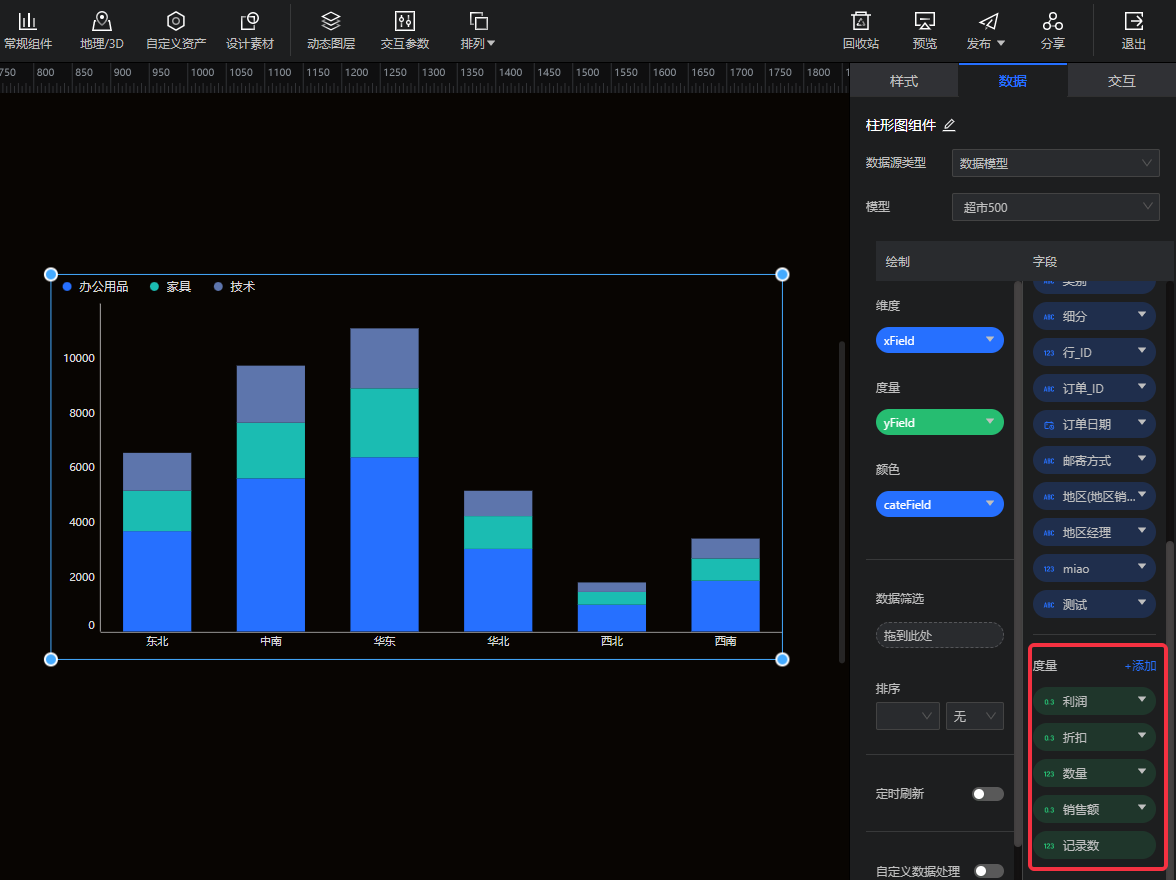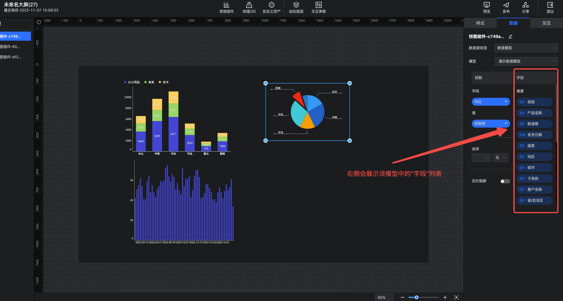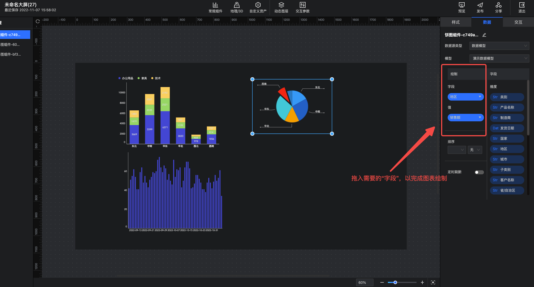 用户可根据需要,将字段拖入图表的配置区域以完成图表绘制。系统有时候会根据字段名称,自动拖入对应的配置区域,你也可以根据需要进行调整。