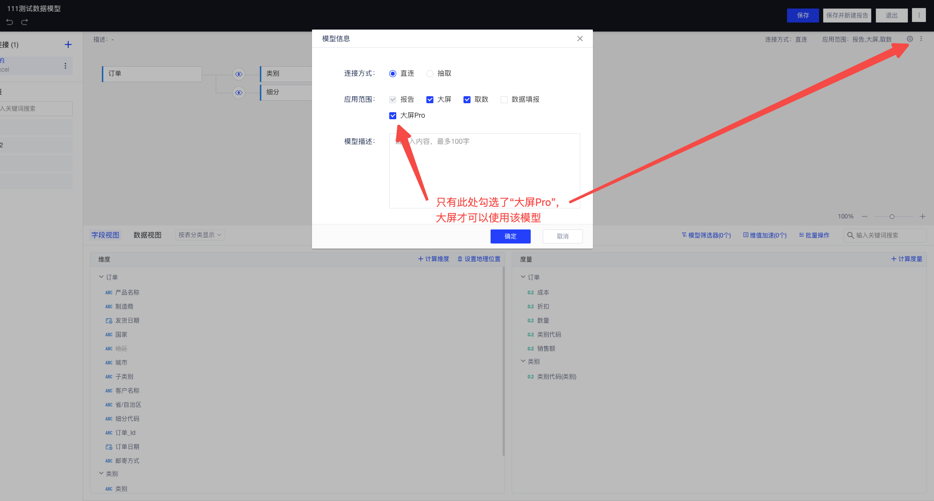 如果你创建了数据模型,但是在这里没找到。可以检查下该数据模型的应用范围设置,是否勾选了允许“大屏pro”使用。