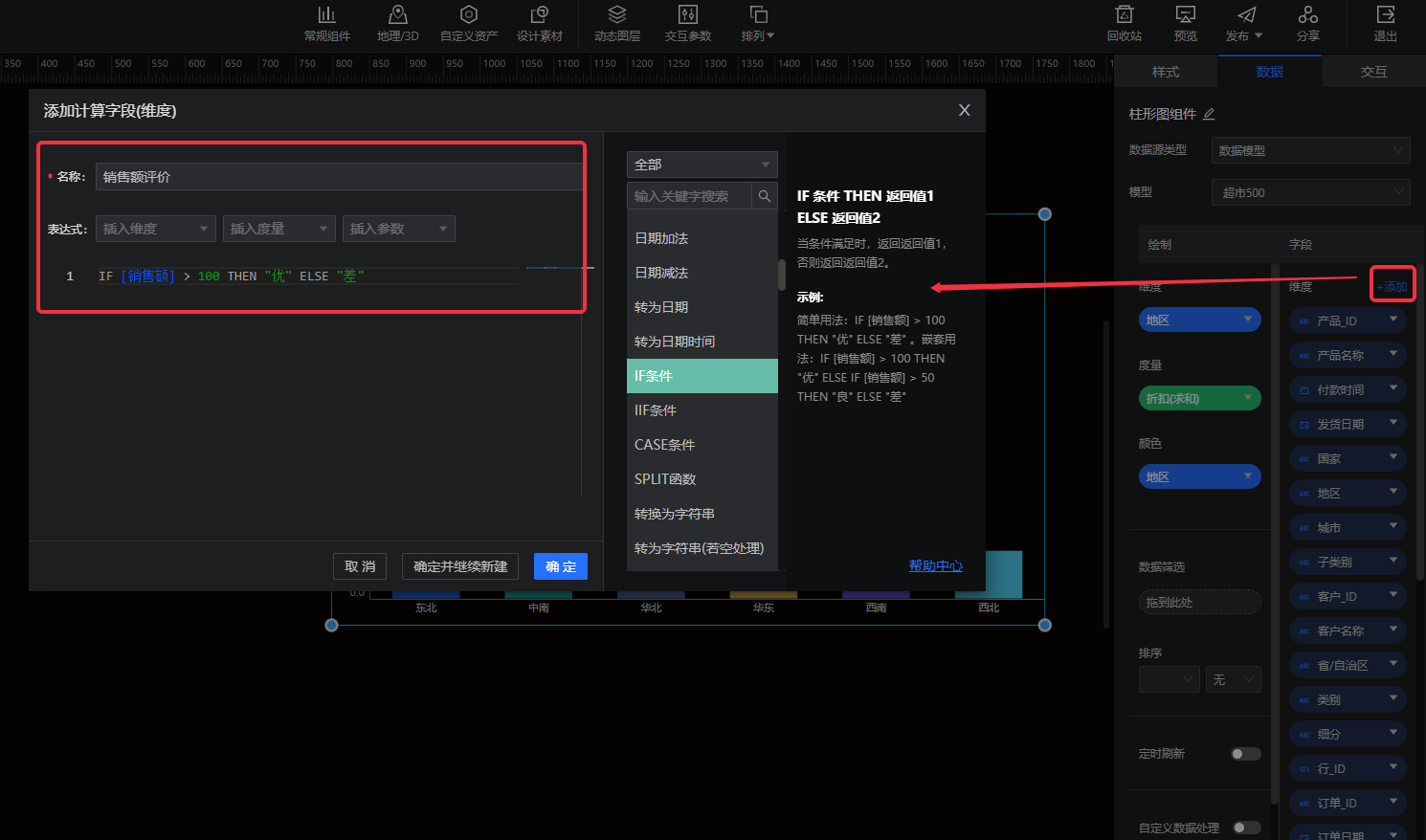 点击字段列表区中维度右侧加号,弹出添加计算字段配置框,依次输入新字段的“名称”和“表达式”。其中,表达式支持插入维度、度量和参数字段。