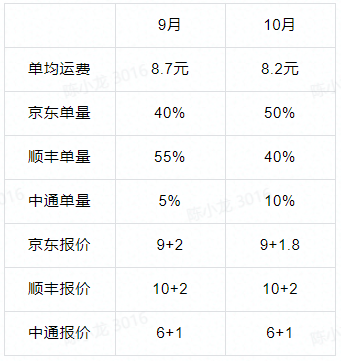 “单均运费从9月8.7元下降至10月8.2元,原因是价格相对比较便宜的中通的单量占比上涨5%,京东单量上涨10%,以及京东的续费价打9折”