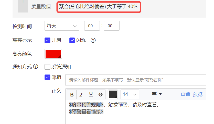 我们不仅可以设置低于某一个定值,也可以当指标高于某一定值的时候进行预警,比如在供应链中,某个大仓的分仓比高于40%,就会导致仓库负荷过重从而影响生产。