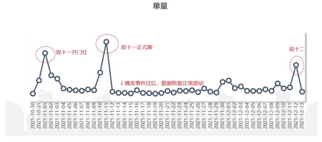 偶发的、突然性的波动。一般是由于短期、突发的事件而影响的指标的波动,比如说某头部主播在某次直播里上了严选的商品、某明星的同款商品在严选有库存等,就会造成订单量临时性的超出预期的上涨。