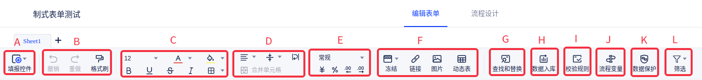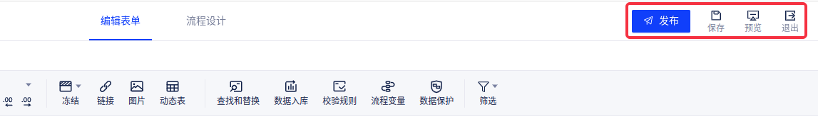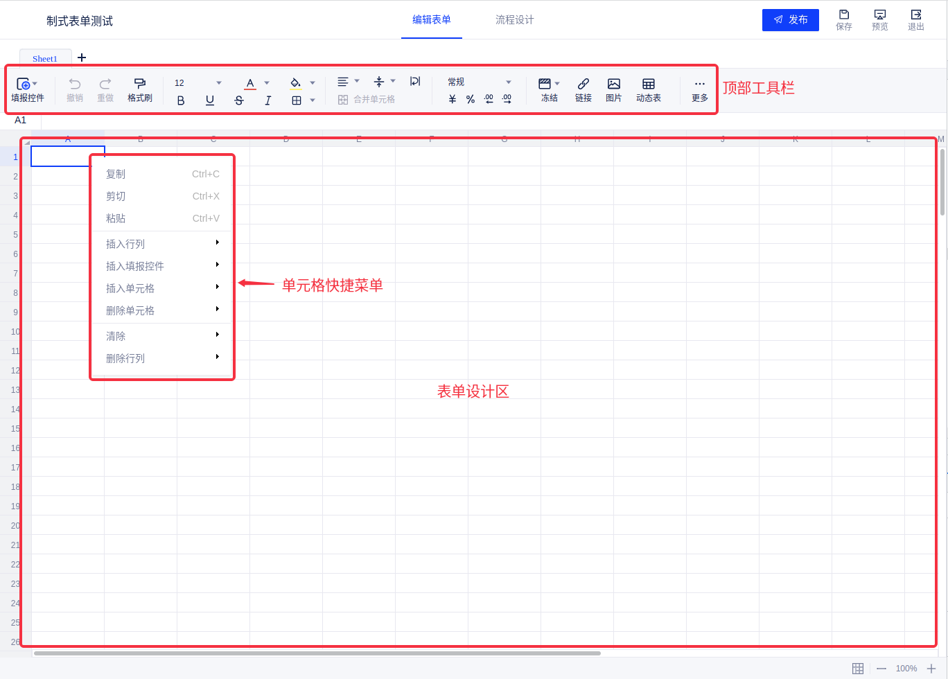 完成创建后便可进入表单的编辑界面,分为顶部工具栏、表单设计区和单元格快捷菜单。