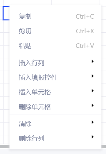 类似Excel的右键菜单,在选中单元格后右键即可弹出,快捷菜单包括复制、剪贴、粘贴、插入行列、插入填报控件、清除、删除行列。用户在进行清除的时候,可以选择单独清除内容或者样式。