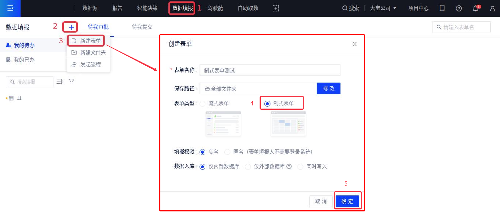 在顶部导航栏选择数据填报模块,制式表单的新建操作如下图所示:
