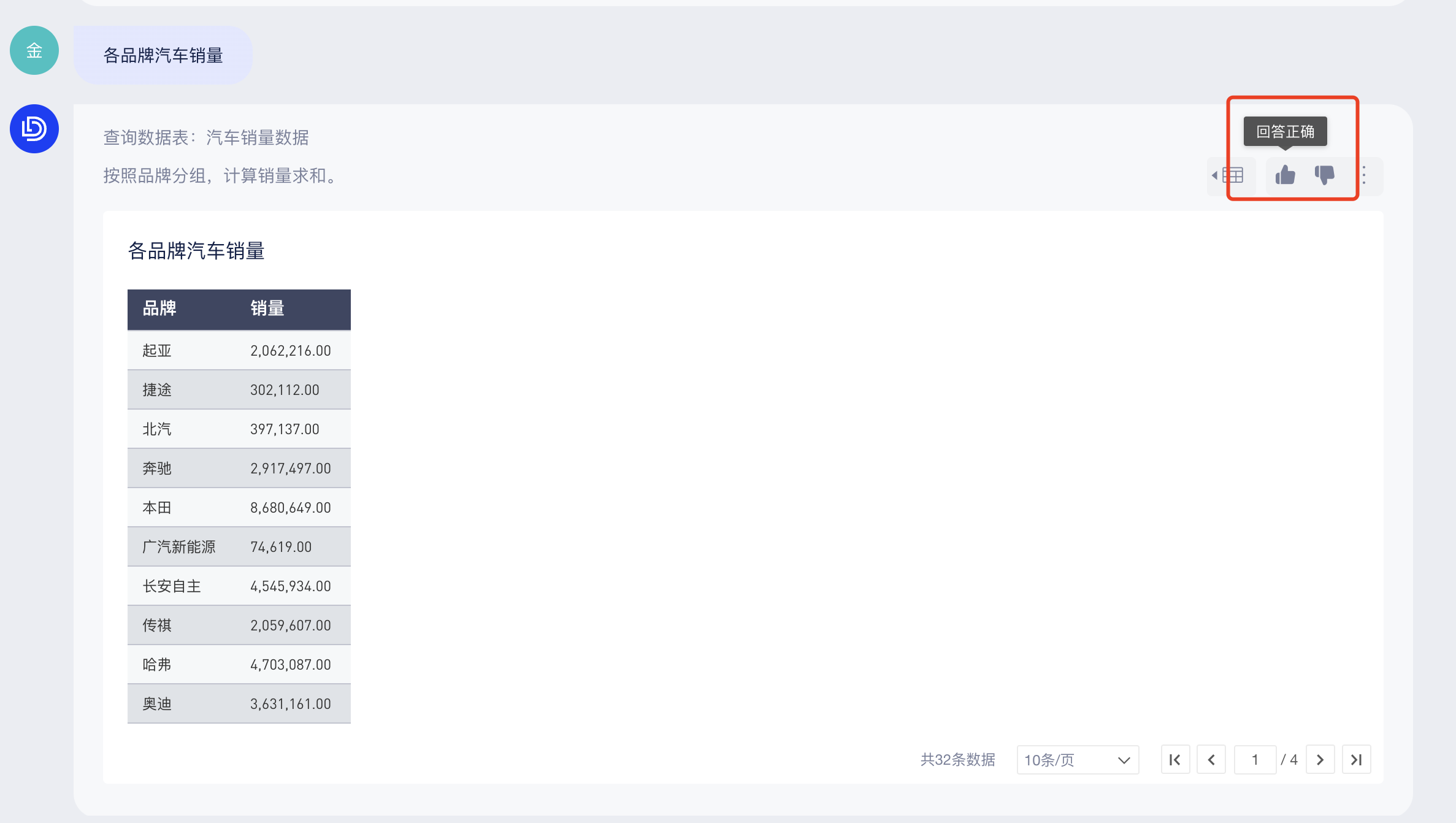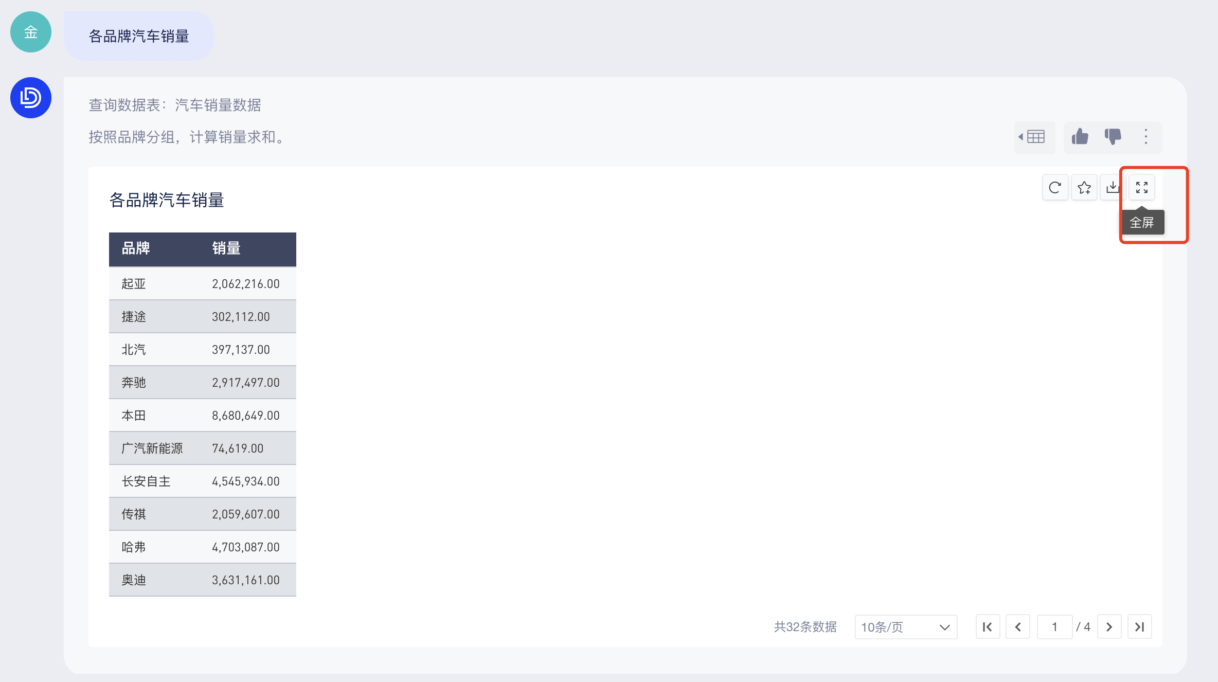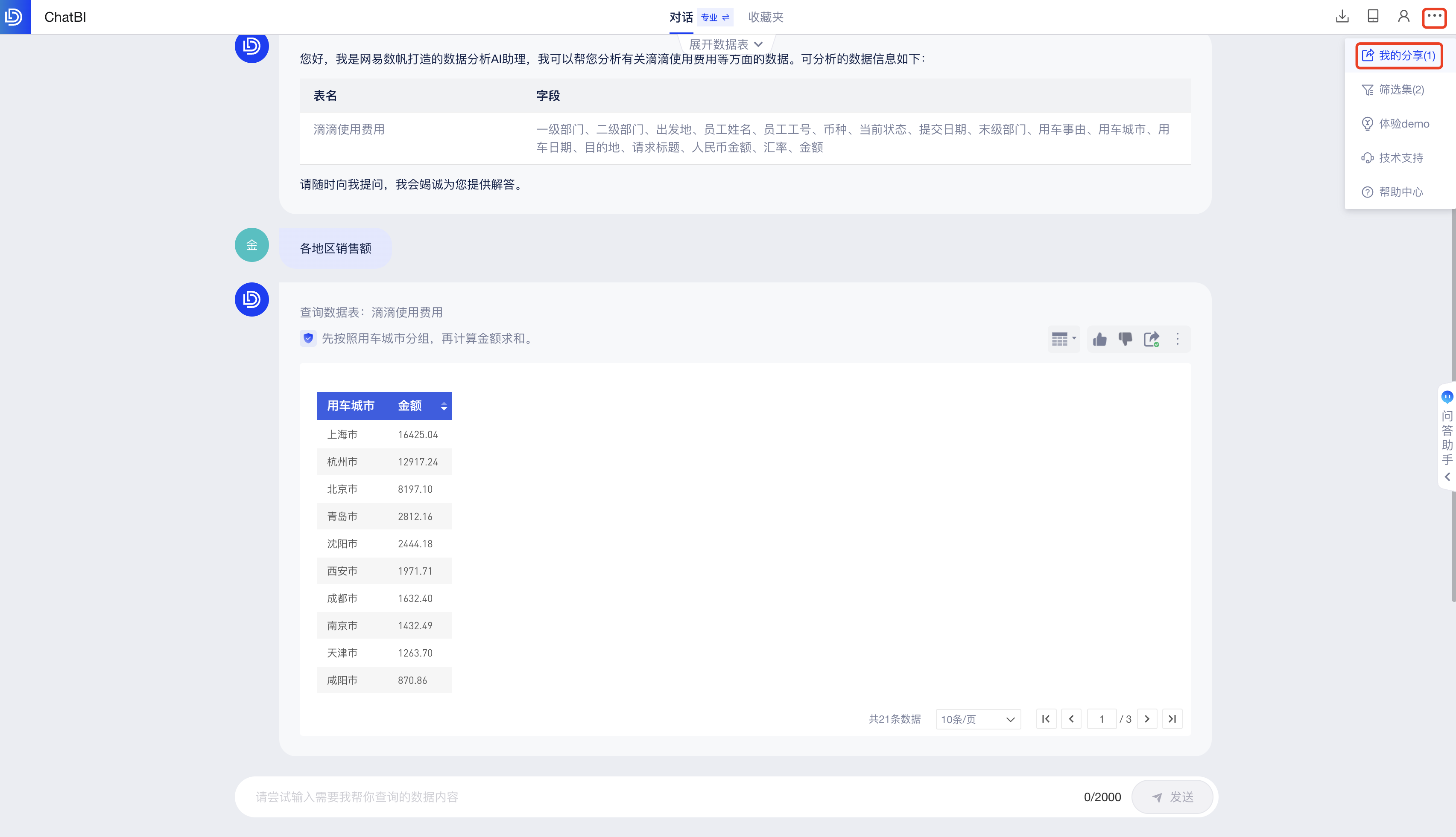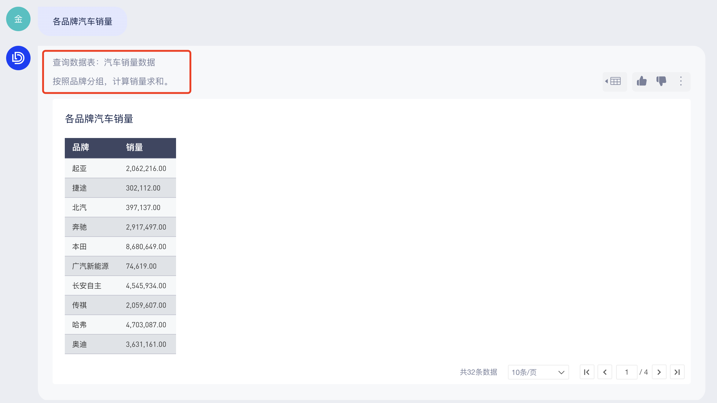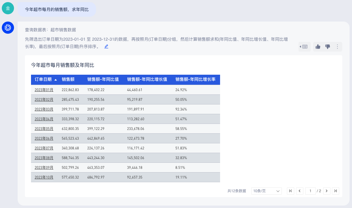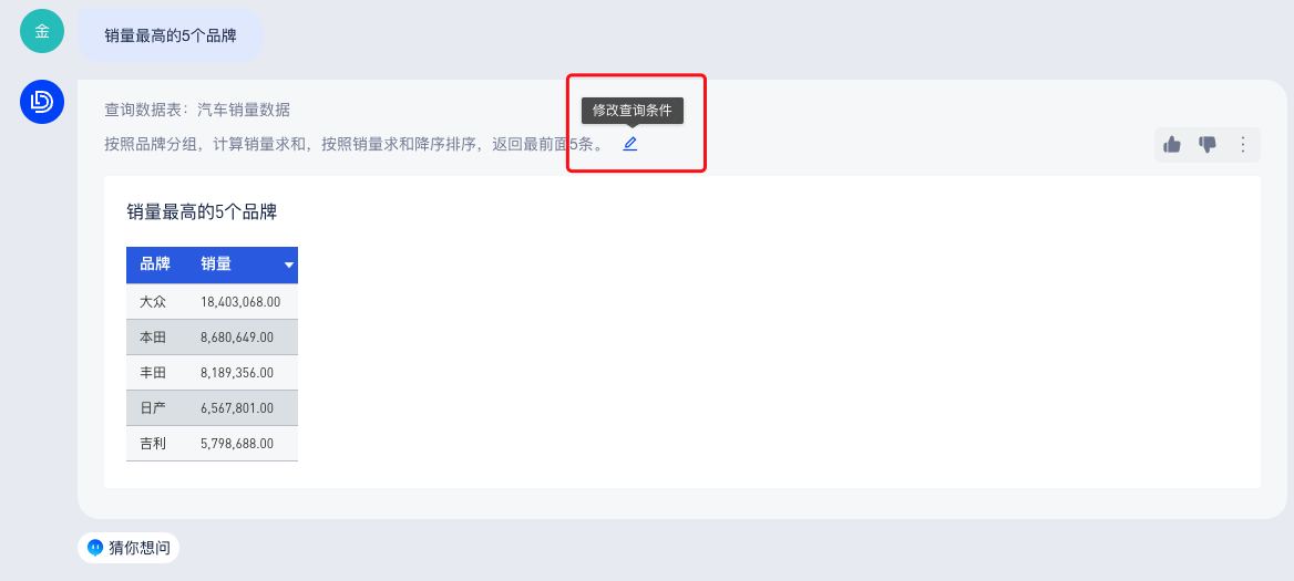 你可以直接在底部输入框中提问(当前仅支持从单个数据表中查询结果),AI助手会回答查询条件和查询结果,如下图:
