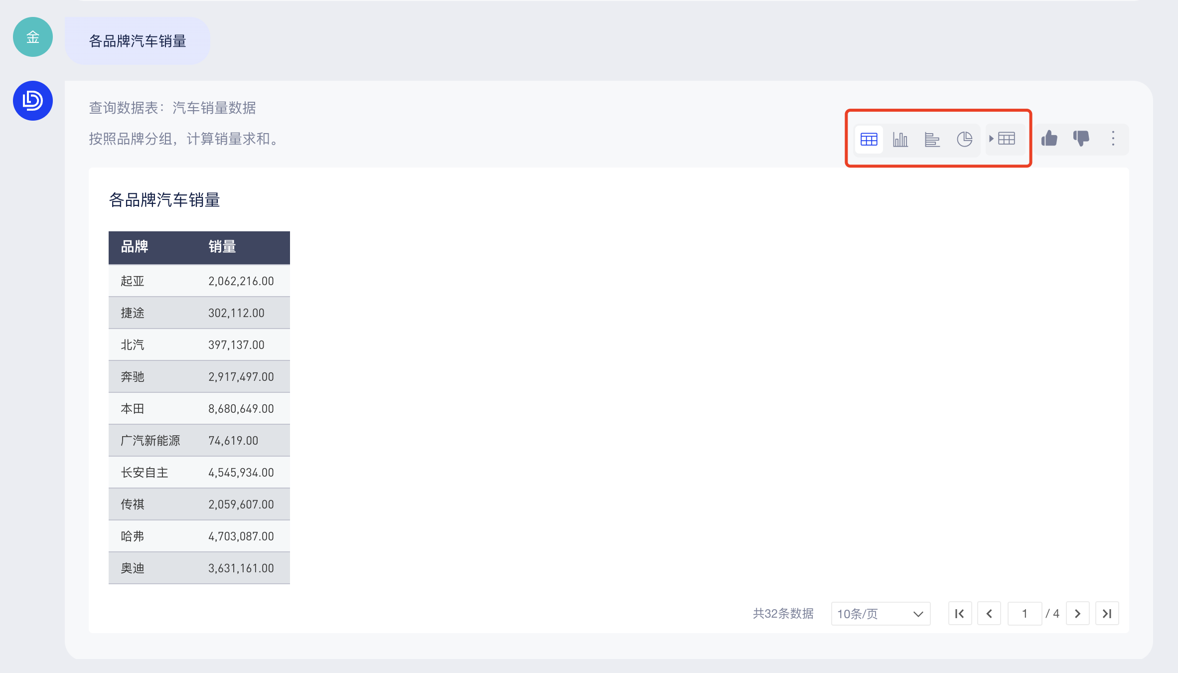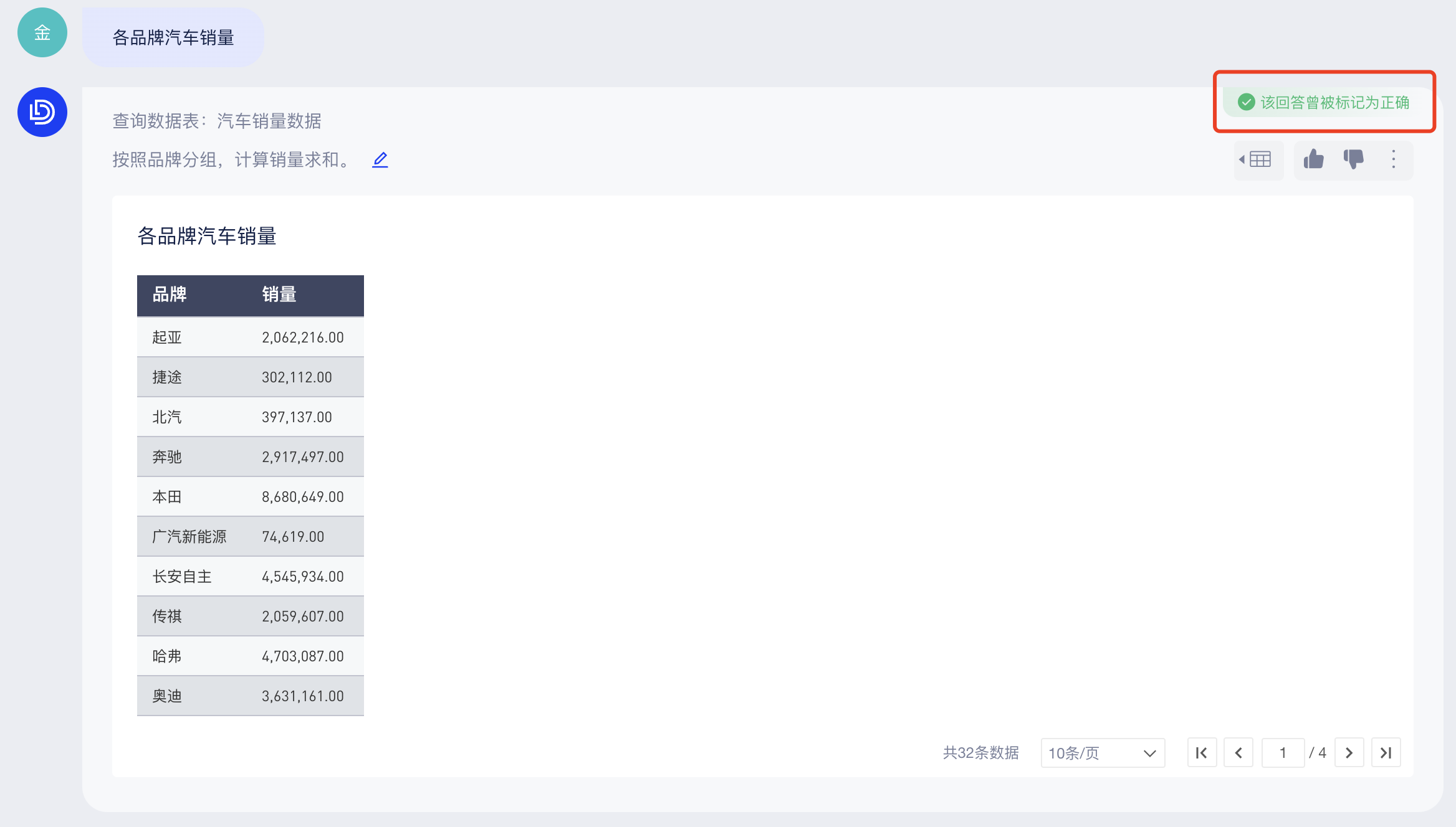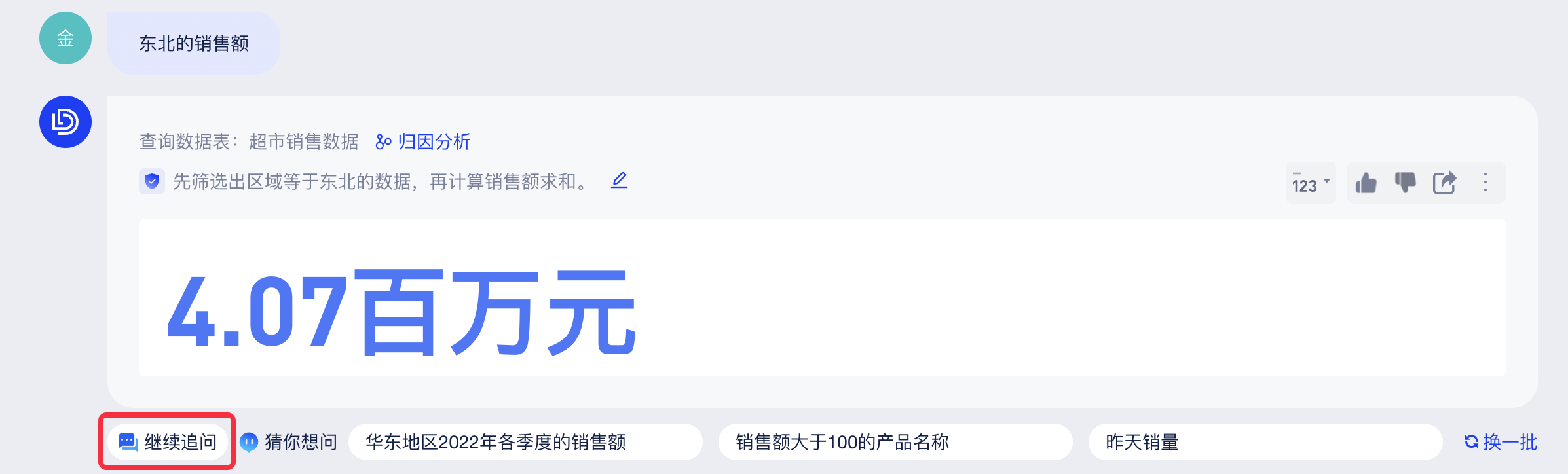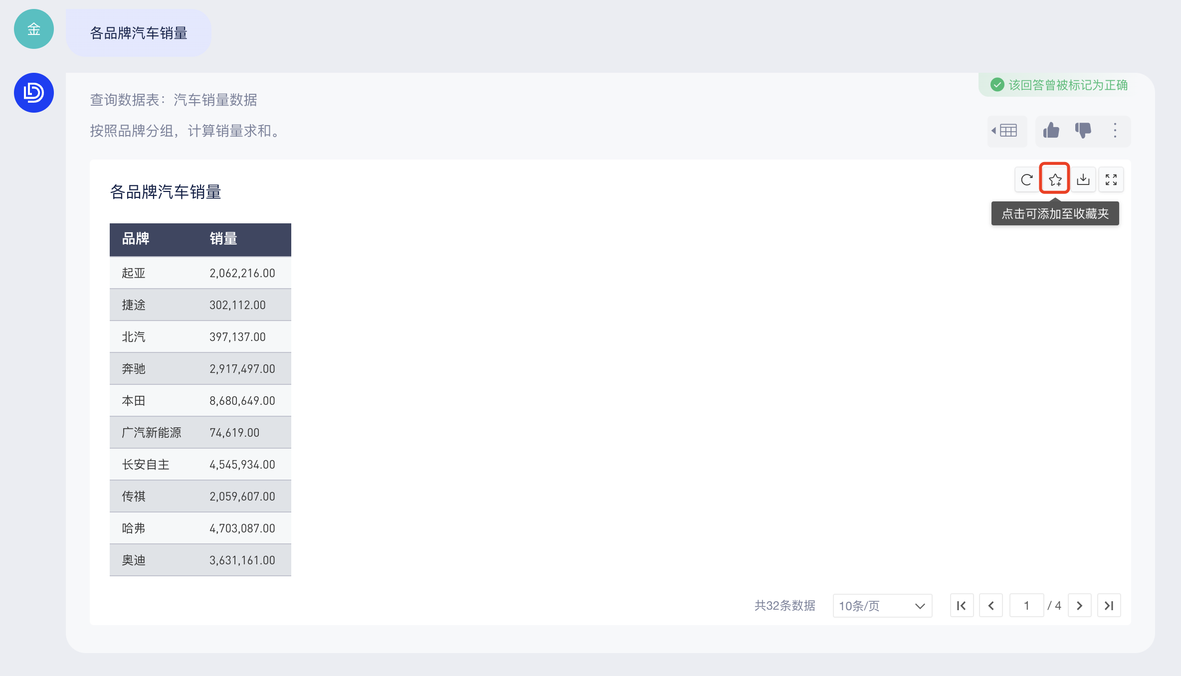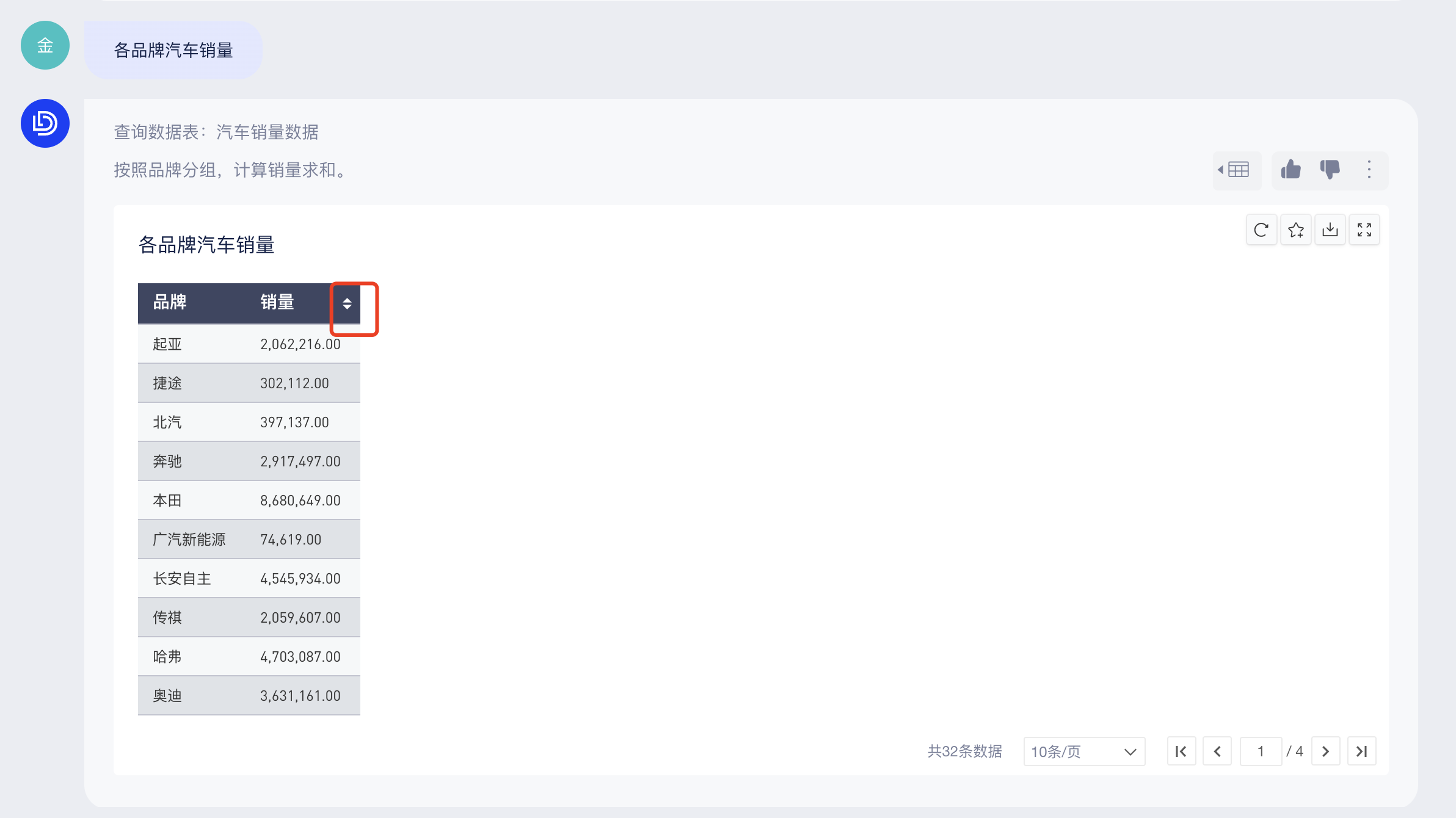 你可以直接在底部输入框中提问(当前仅支持从单个数据表中查询结果),AI助手会回答查询条件和查询结果,如下图: