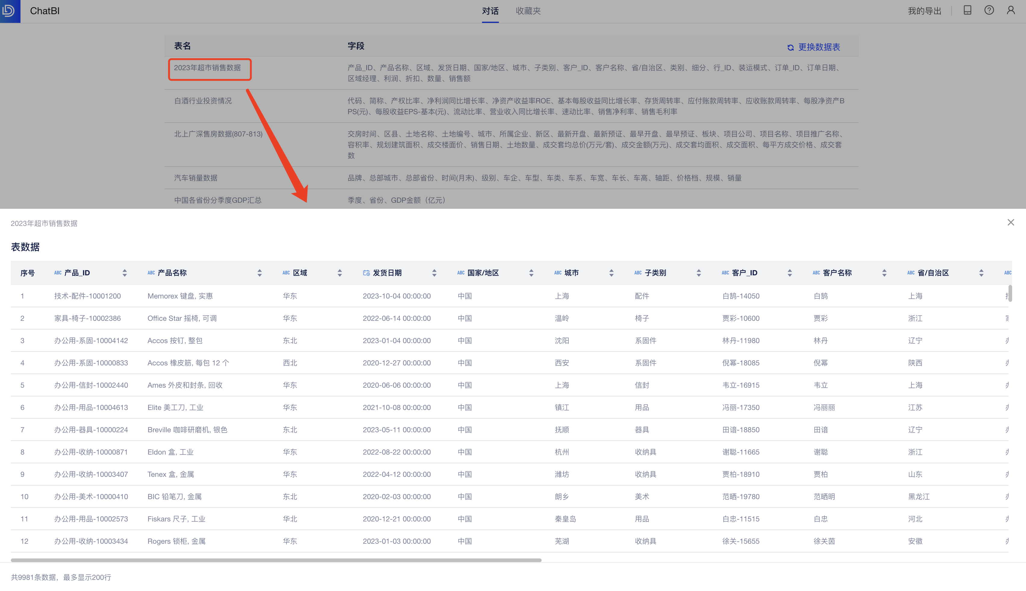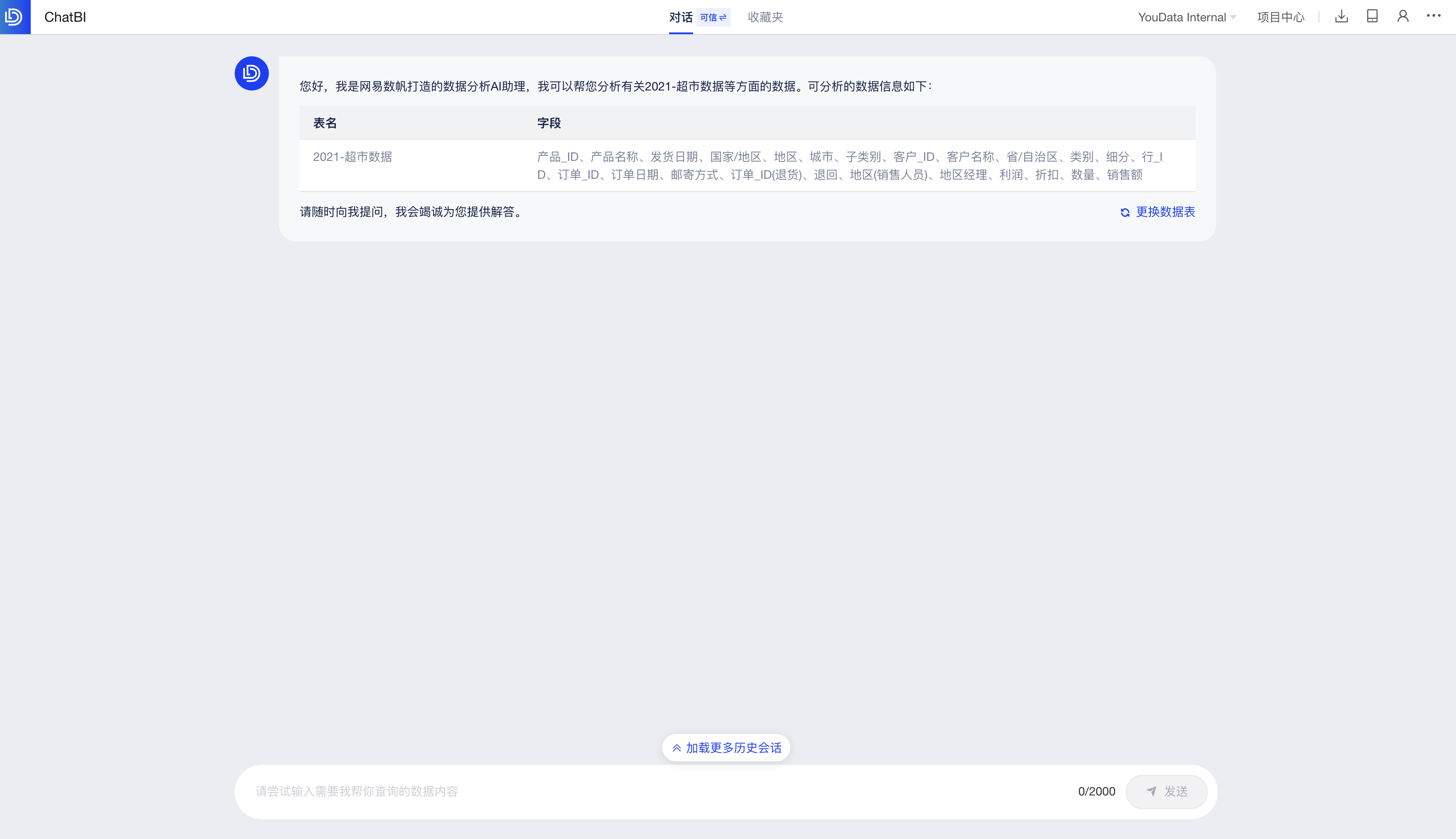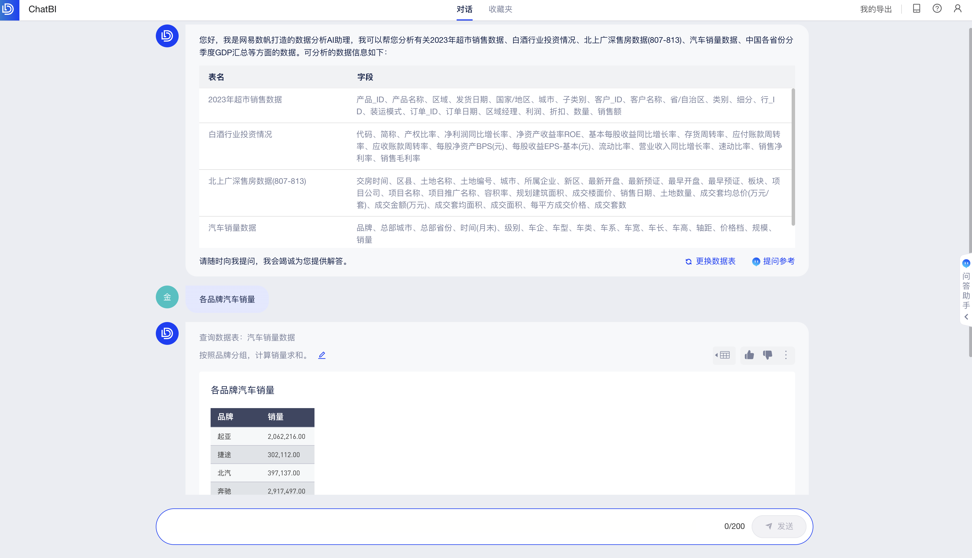 AI助手首先会向你介绍你可以使用的数据表有哪些,如下图: