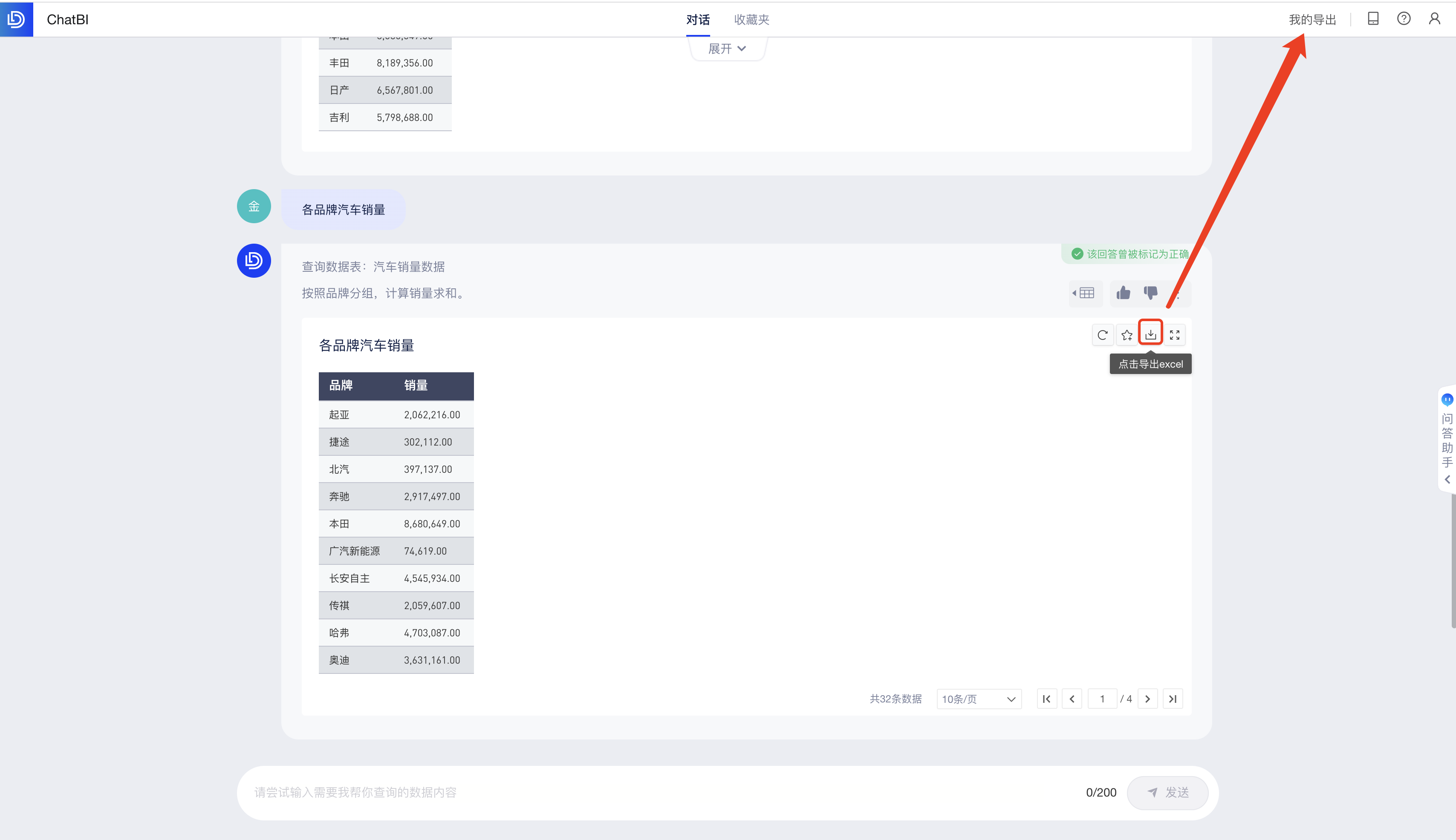 问答结果的数据支持导出为excel,并在「我的导出」查看7天内的导出记录。