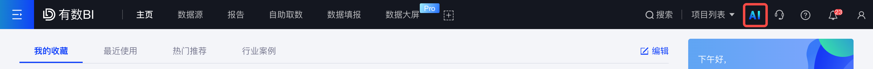 从有数BI的顶部导航的右上角点击“AI”图标,即可进入ChatBI的聊天窗口,如下图: