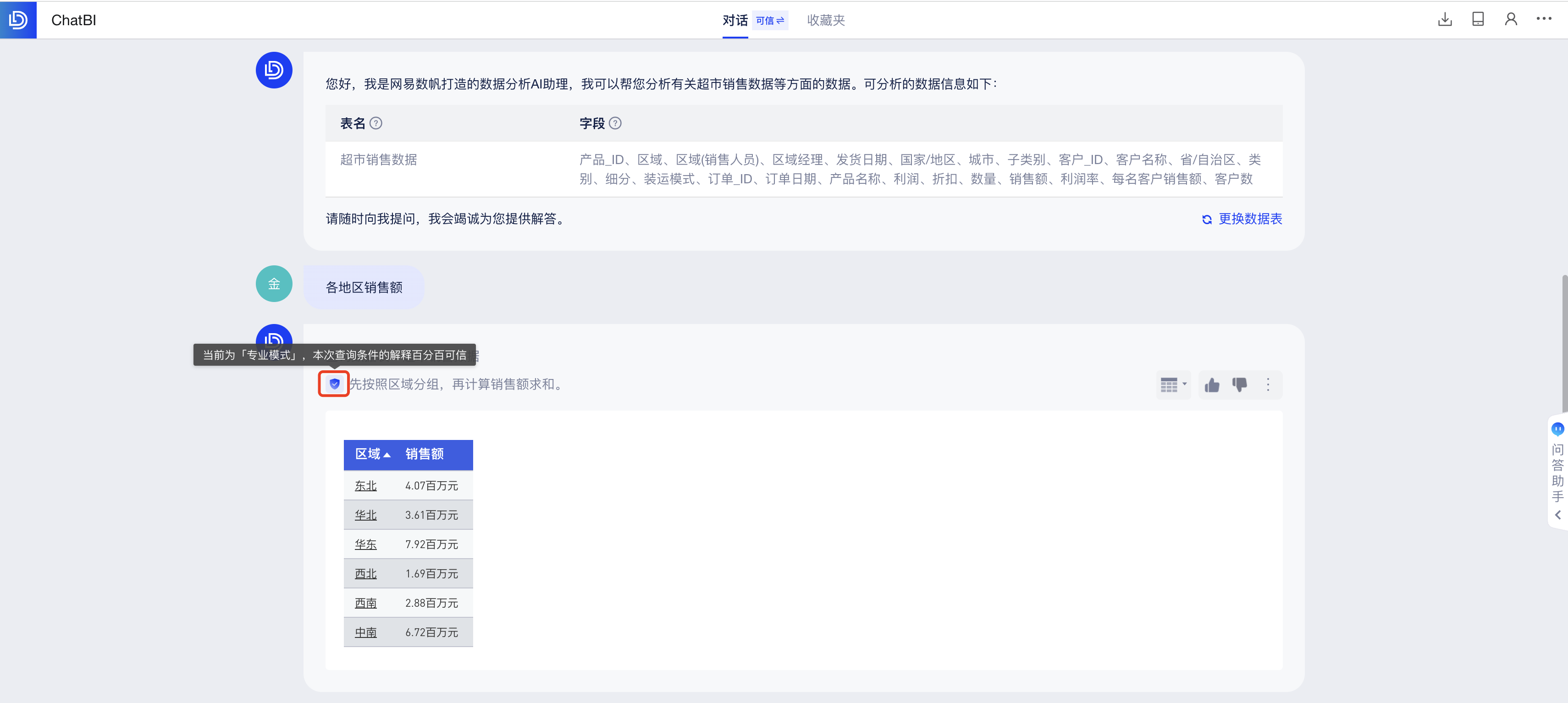 自然语言方式透出所选的数据表和AI的取数逻辑(自然语言描述和实际取数逻辑100%等价),业务用户可以通过取数逻辑判断结果的准确性。