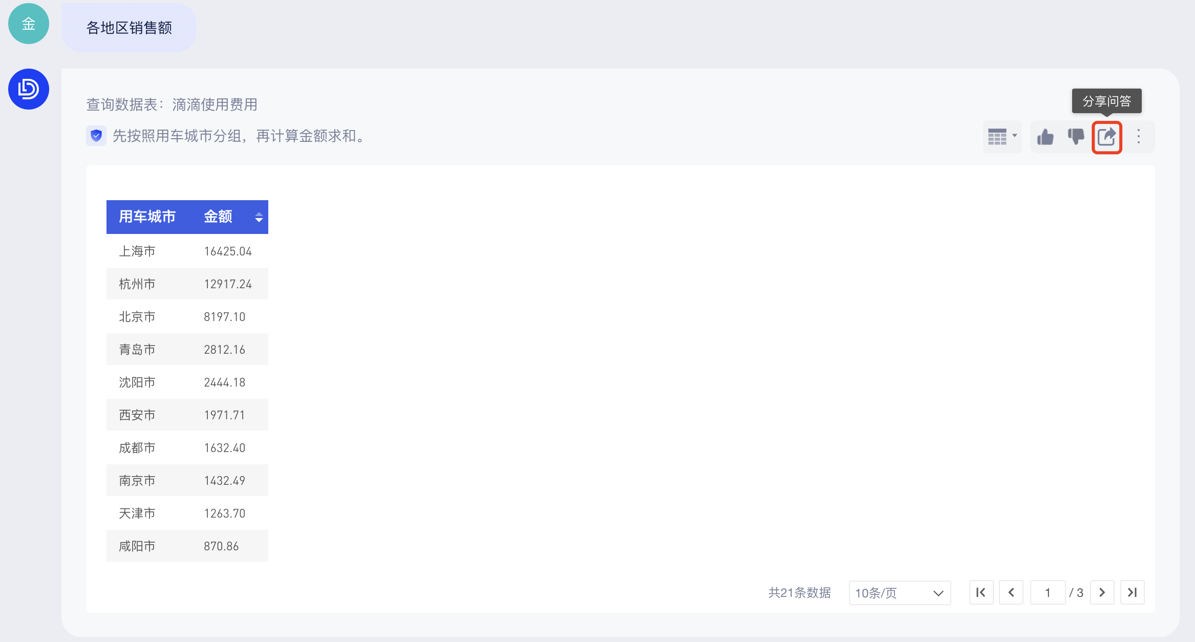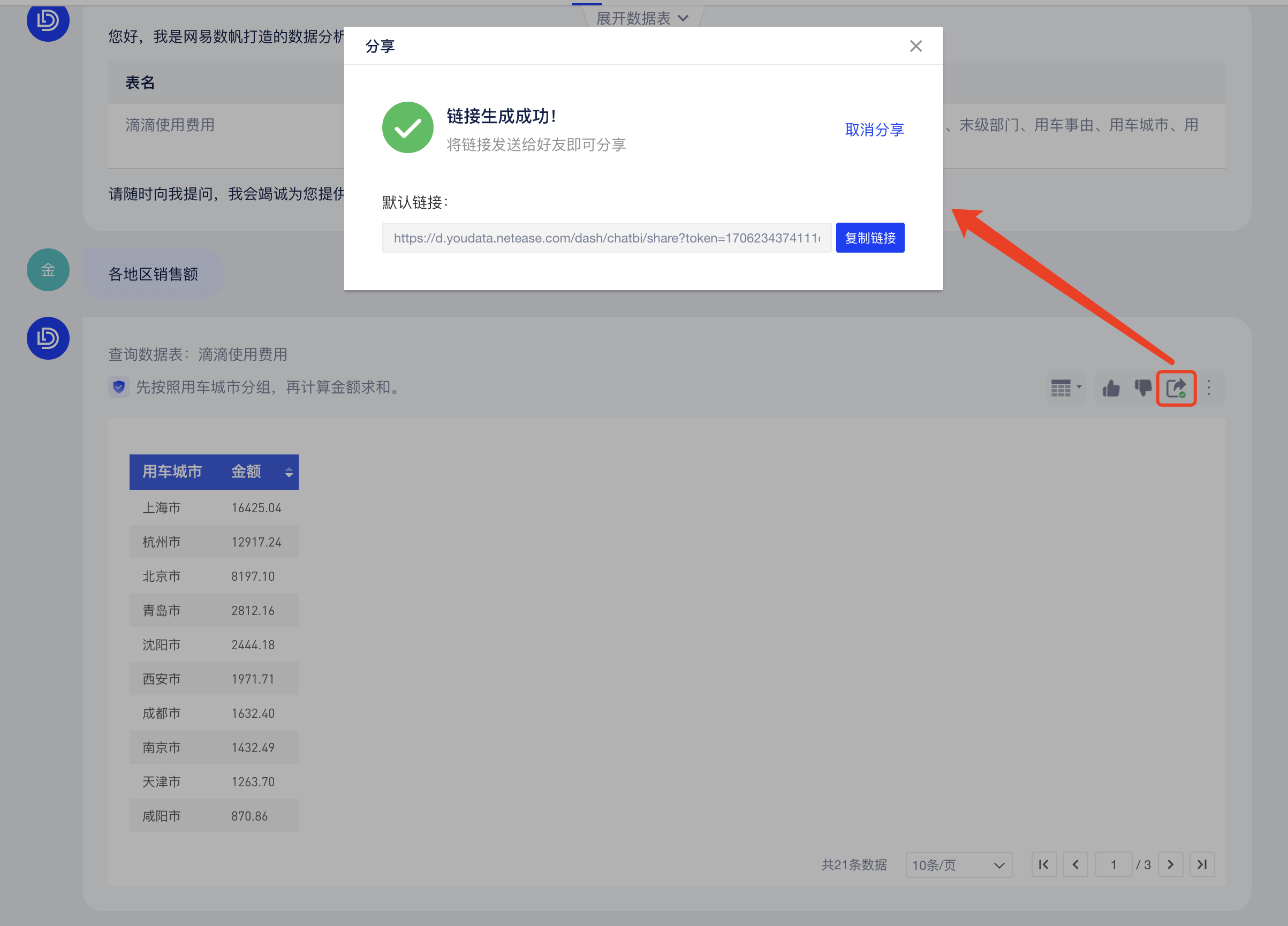 如果你想和其他人共享你通过ChatBI问答得到的结果,可以点击问答右上角的「分享」按钮: