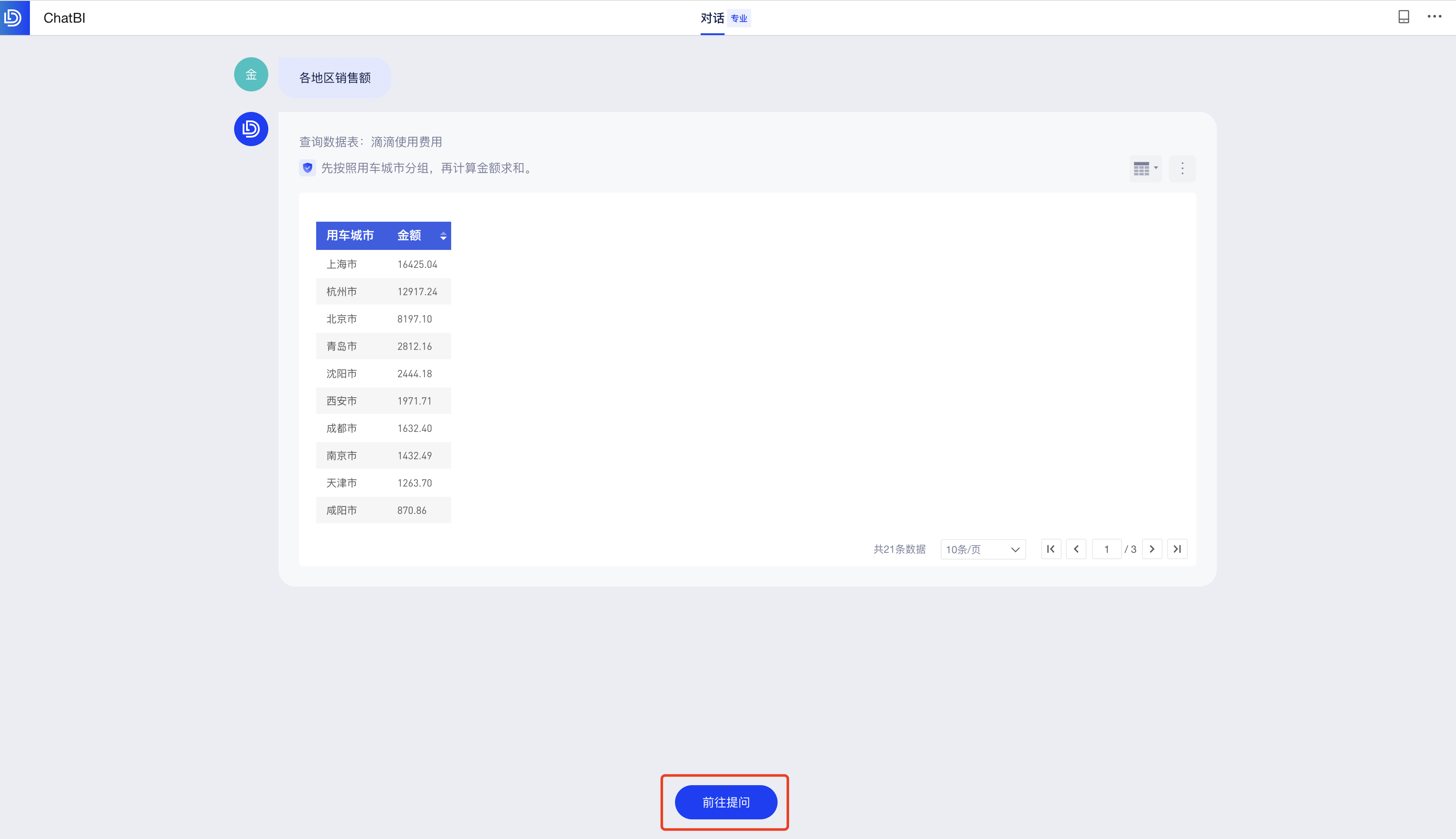 被分享人打开分享链接后,即可查看您的好友分享的问答数据,该页面仅支持查看与切换图表类型,若被分享人想要自己在ChatBI继续探索数据,可点击分享页面最下面的「前往提问」按钮,点击后即跳转到ChatBI的问答页面进行提问分析: