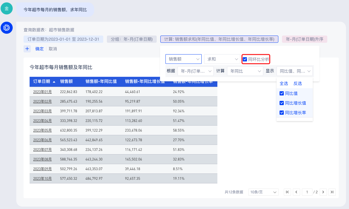 对于时间序列的指标,可直接在问答中指定要查看的同环比,ChatBI自动计算同环比的值、增长值及同环比率;并且可以在问答结果的查询条件中修改同环比分析的展示,灵活可定义。