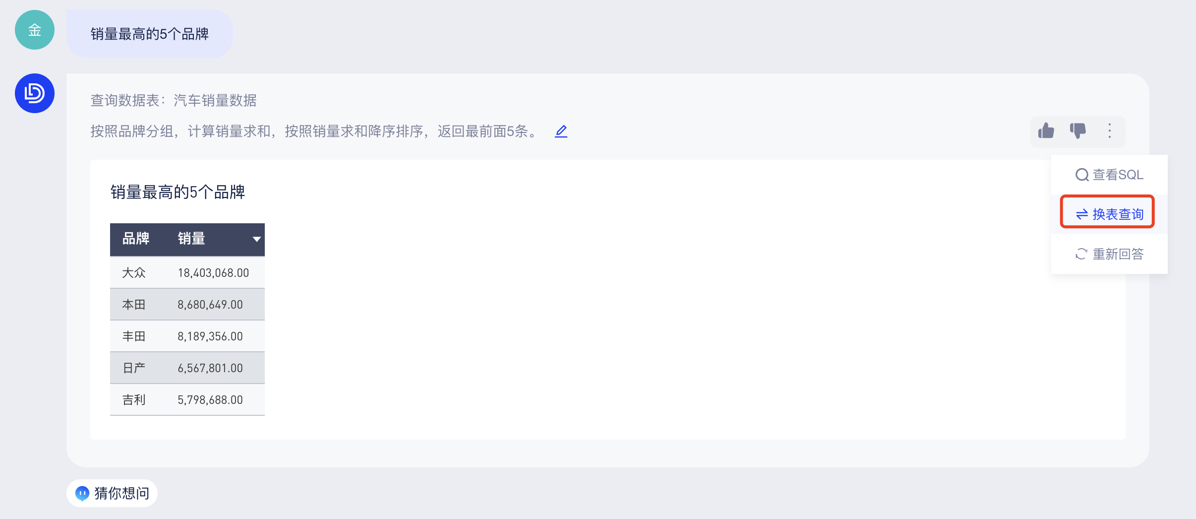 若AI选错了数据表,可点击「换表查询」,校正为正确的数据表。