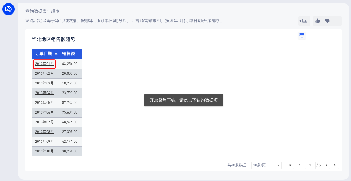 图表下钻:日期字段默认开启「聚焦下钻」,点击日期单元格后自动下钻到下一层级的日期粒度,如:从“2023年1月”下钻到“2023年1月1日~2023年1月31日”;另外,对于非日期类型字段,您也可以在模型侧配置好字段的下钻层级(配置操作详见:层级钻取),则Chatbi侧也同样支持下钻。