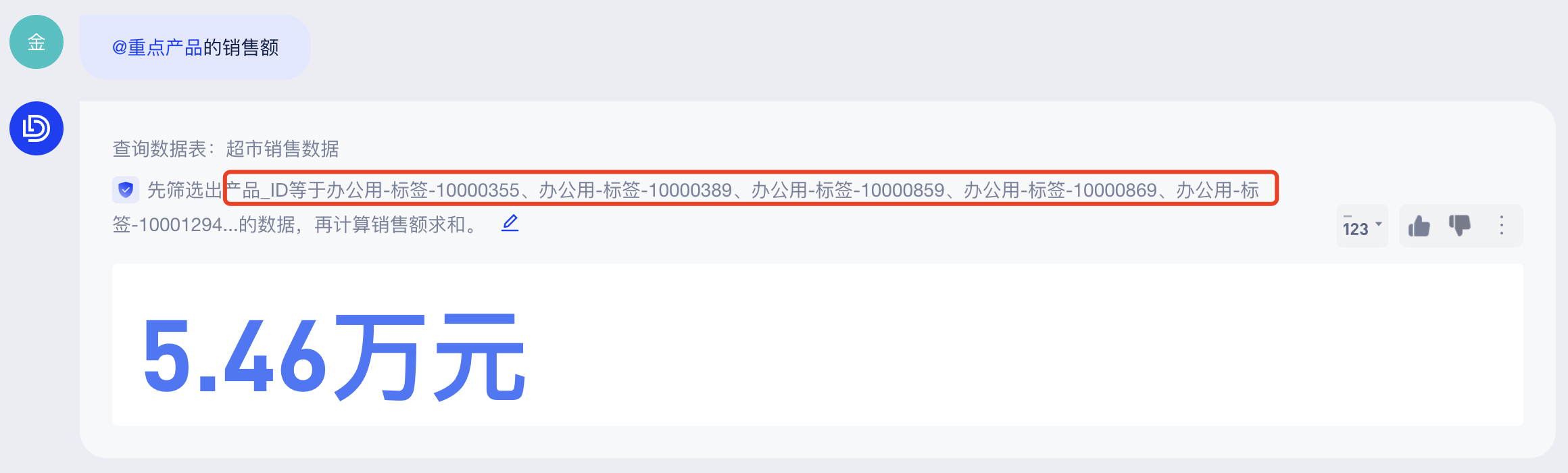 在数据查询时,常常需要对某个字段做批量筛选,比如:销售负责人有自己关注的上百个重点产品ID,在问答窗口一个个输入ID显然不现实,此时可以借助ChatBI的「筛选集」功能,先定义一个筛选集,然后在问答中引用该筛选集,“一次定义,多处复用”,快捷实现批量筛选: