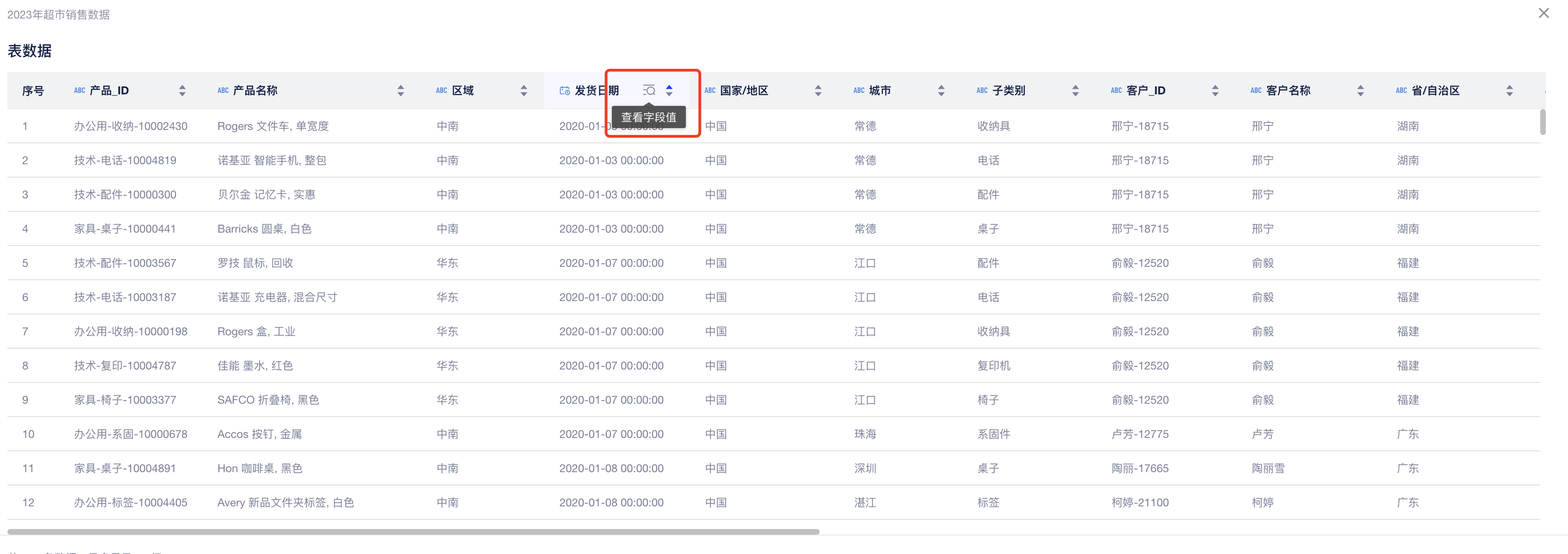在表格的列标题上点击排序:鼠标hover到表格的表头区域,即出现「排序」按钮。