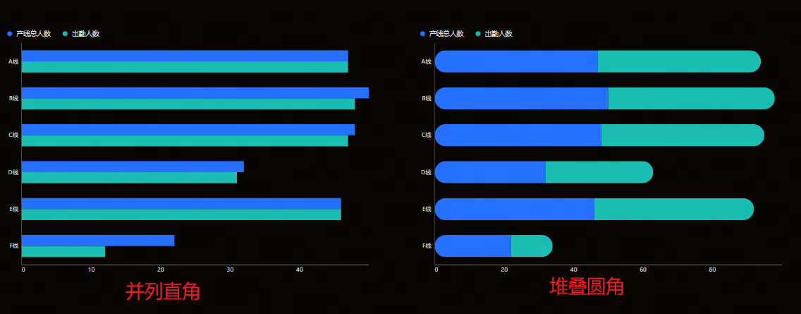 - 条形:设置条形为“堆叠”或“并列”,“直角”或“圆角”,并列间距,柱子宽度以及颜色。