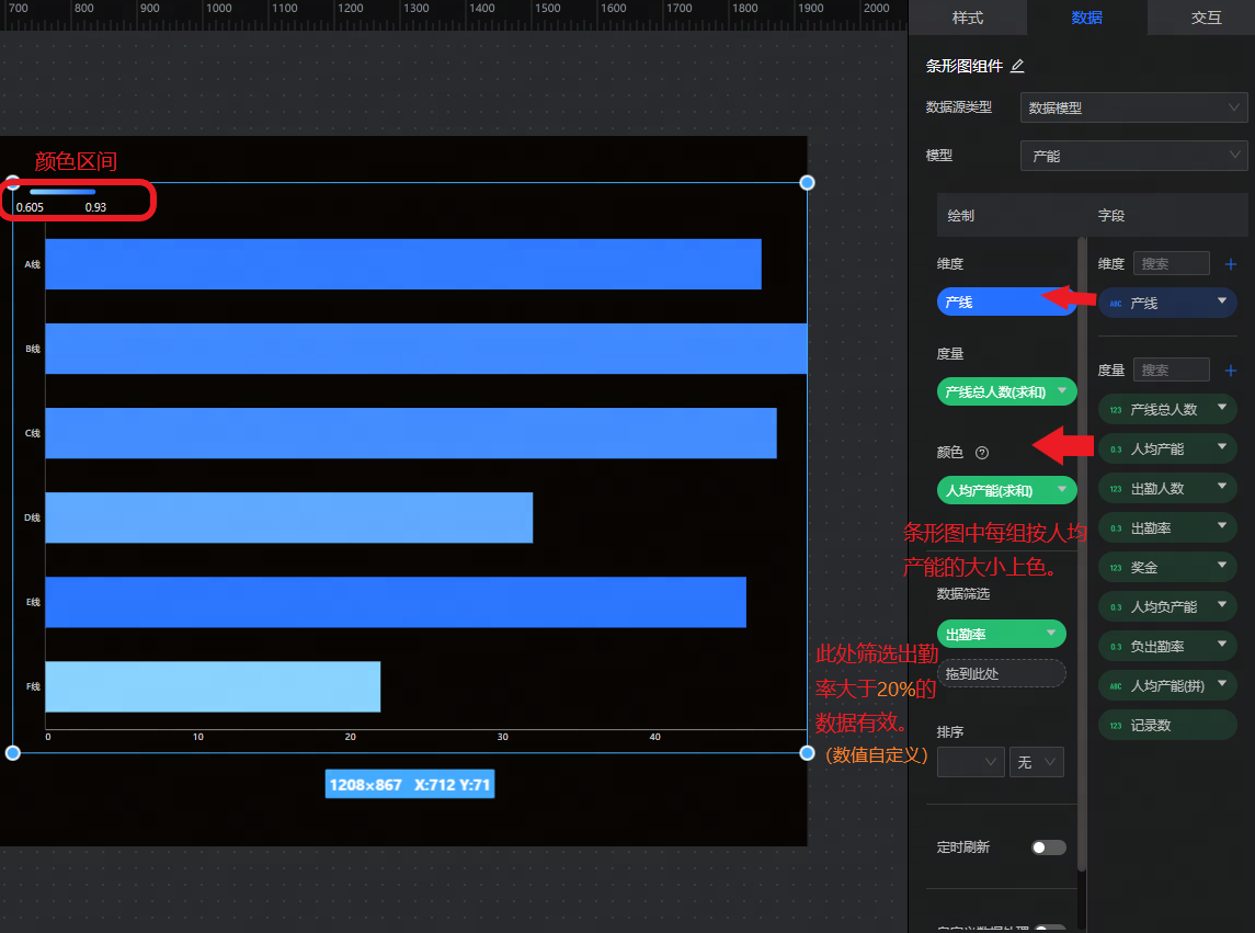 - 度量:设置柱形图y轴的度量字段,如下图所示为“人均产能”。