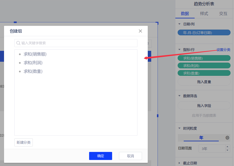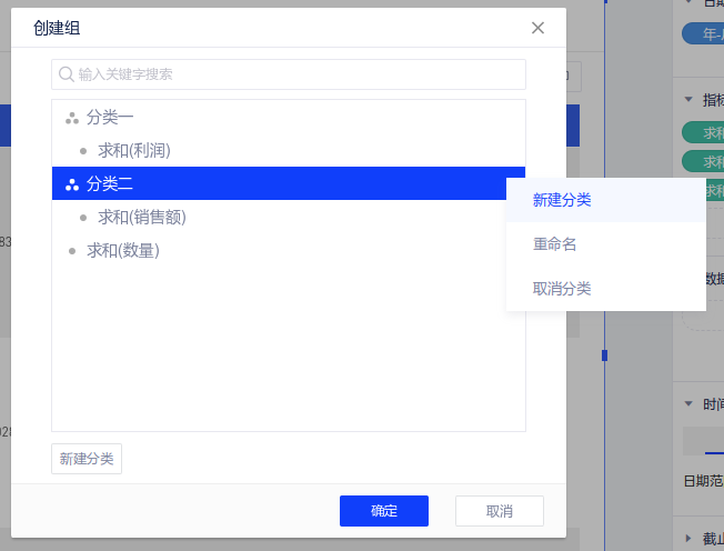 (1)点击指标/行区域右上角【设置分类】出现设置分类弹窗: