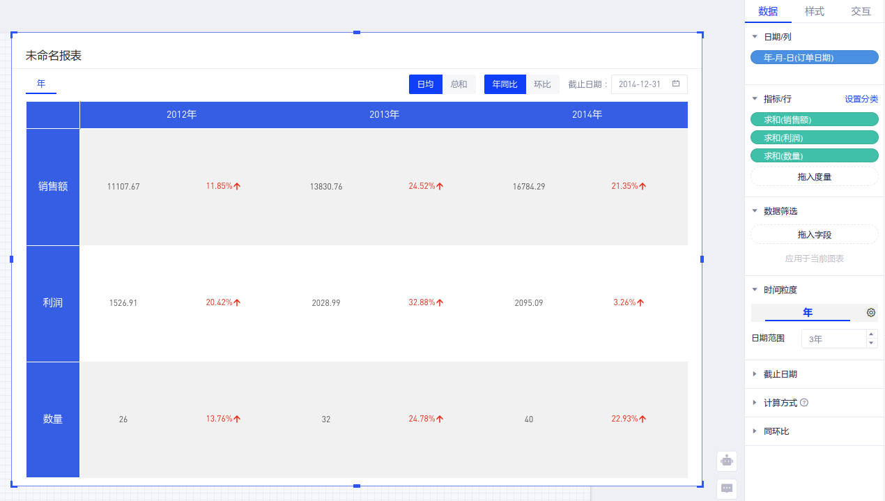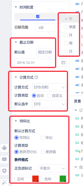 (3) 在图表右侧的数据面板中配置需要展示的时间粒度、截止日期、计算方式和同环比,图表即配置完成。