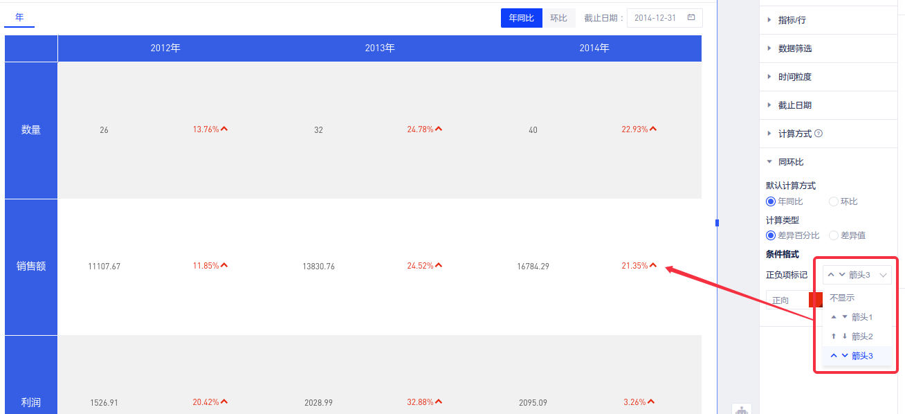 - 支持配置条件格式,包括:正数和负数的图标样式、颜色;