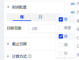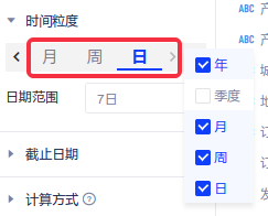 (1)支持快捷切换时间的展示粒度,同时每一个时间粒度支持单独设置日期范围。您可配置趋势分析表展示的时间粒度,当前支持的时间粒度包括:年、季度、月、周、日,默认勾选年;
