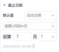 日期粒度中可以配置日期的范围,而截止日期即这个日期范围往前推的基准日期。支持动态日期与固定日期两种类型。其中动态日期与“日期筛选器-动态时间“中的“结束时间”选项一致,默认为昨天。