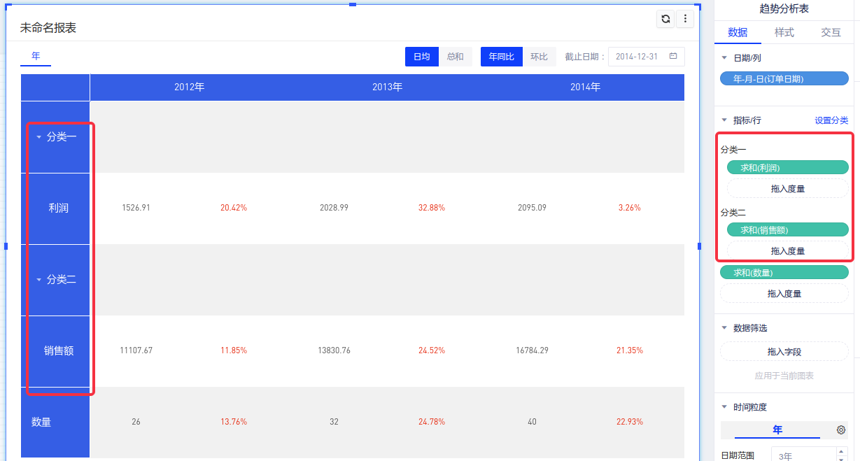 | 趋势分析表 | 1个日期字段 | 1个或多个 |