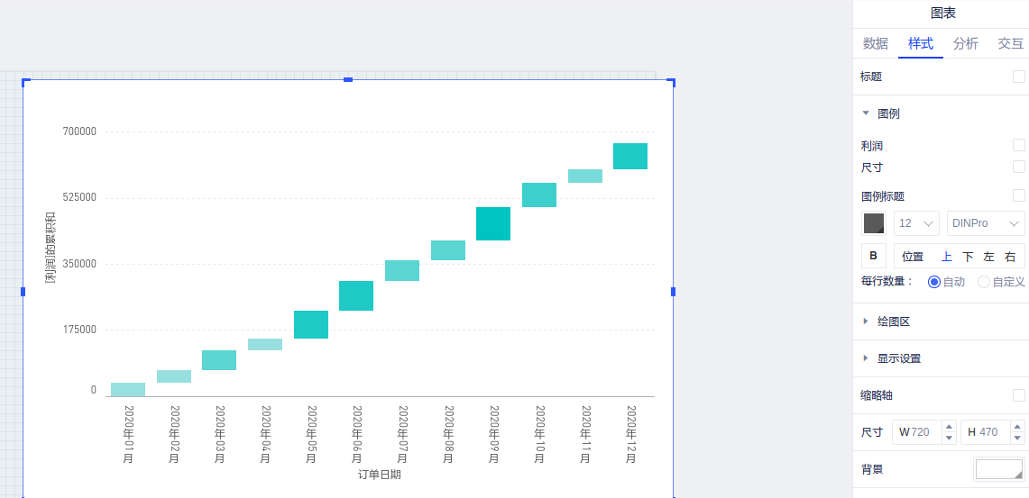 (6)将【订单日期】拖入筛选区域,通过固定值筛选出2020年的数据;再将【利润】【尺寸】图例隐藏,得到一个初步的瀑布图。